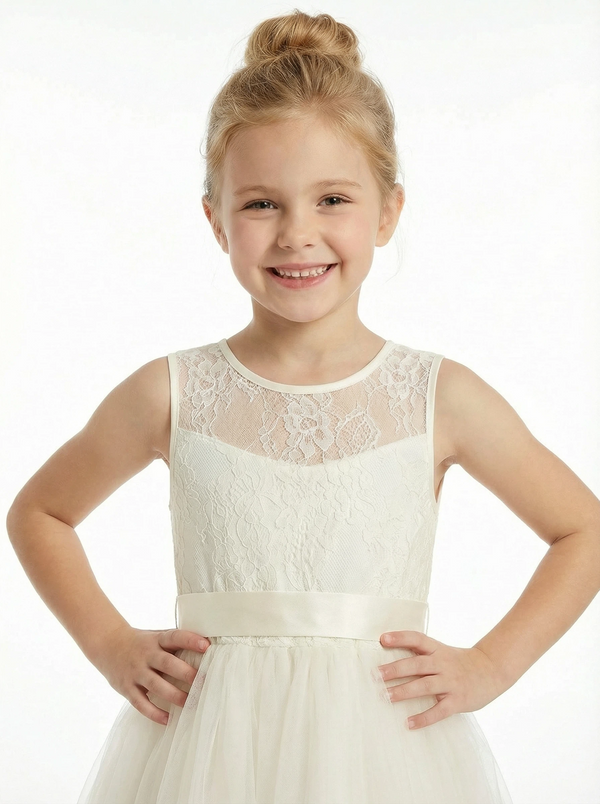 Cute Flowery Dress Lace Girls Wedding Party Dress A-Line Tulle Ball Gowns Sleeveless