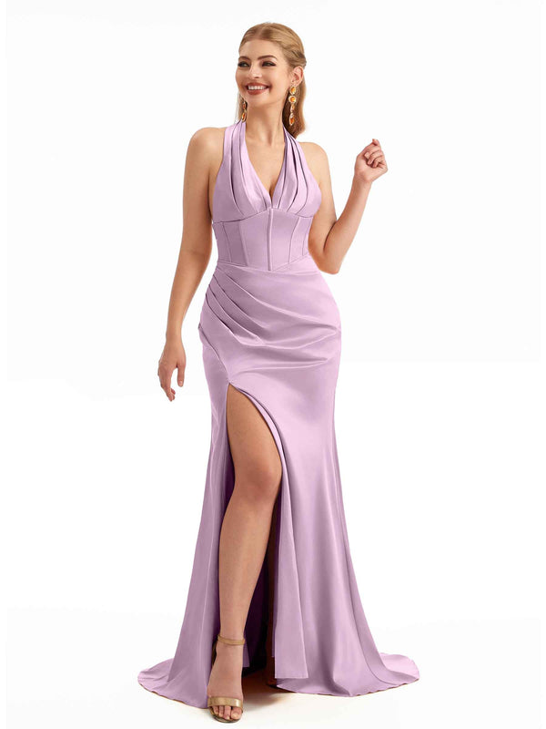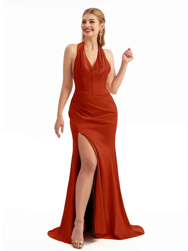 Satin Halter Fall V-neck Bridesmaid Dresses