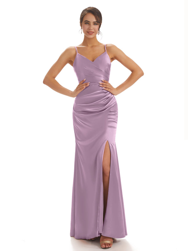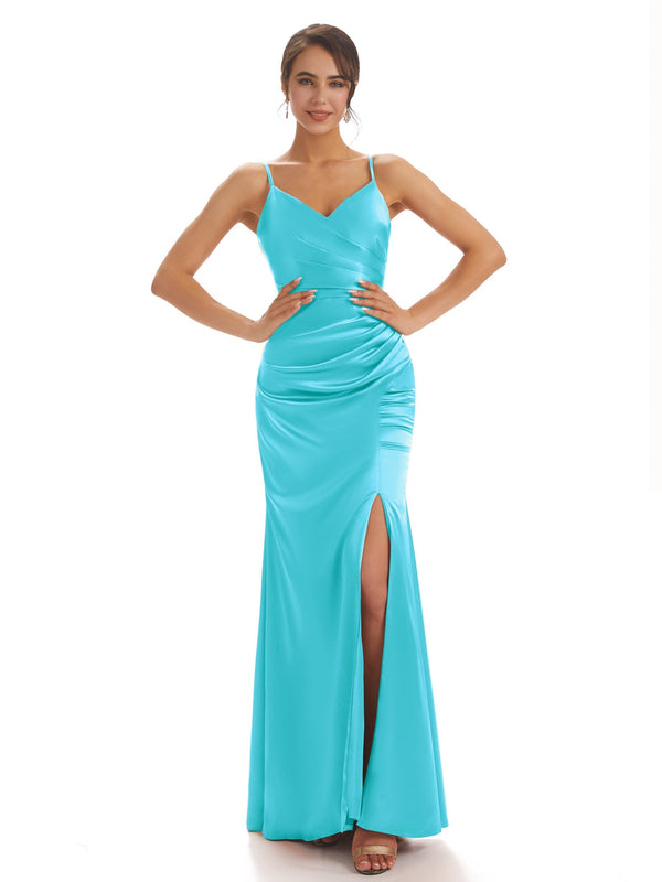 Spaghetti Straps Fall Satin Pleats Long Bridesmaid Dresses