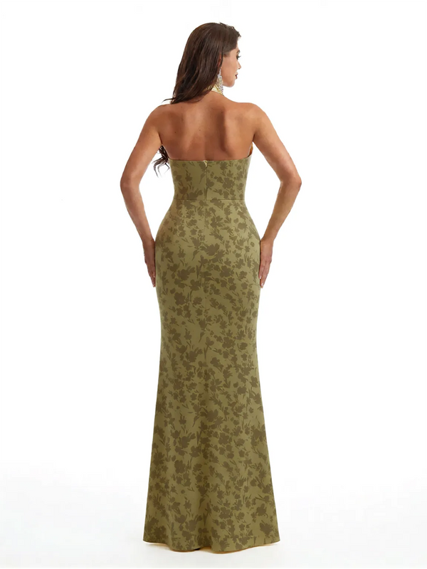 Simple Halter Side Slit Mermaid Floral Satin Maxi Floral Formal Dresses For Women