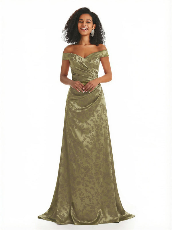 Trendy Off Shoulder A-Line Long Floral Satin Women Formal Evening Dresses