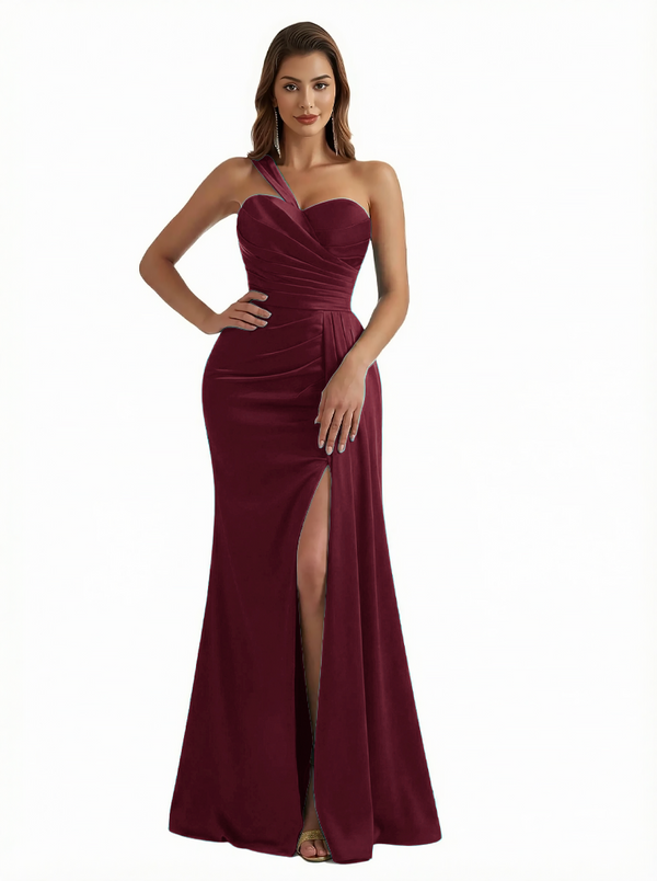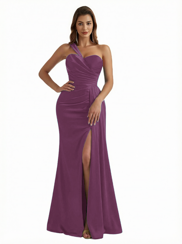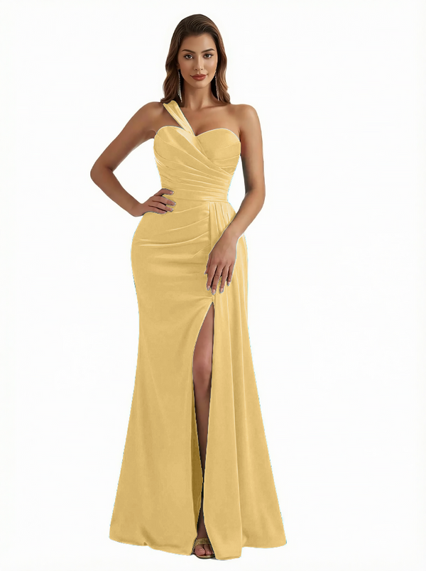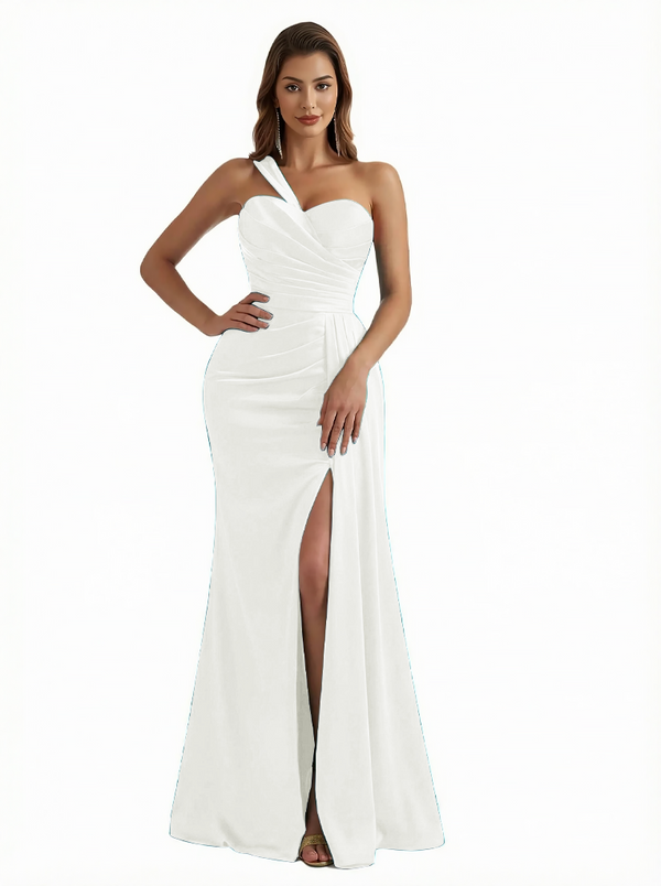Sexy One Shoulder Ruched Silky Satin Mermaid Long Evening Dresses For Women Side Slit
