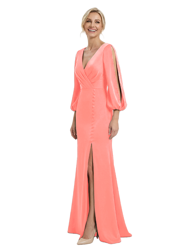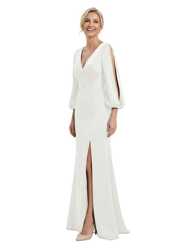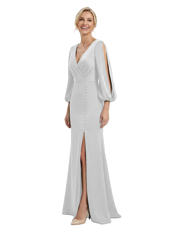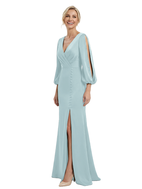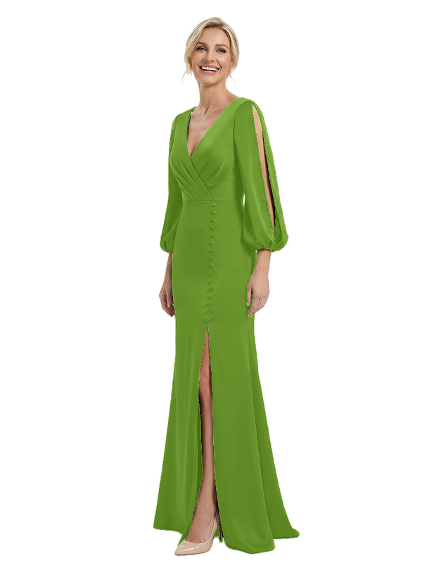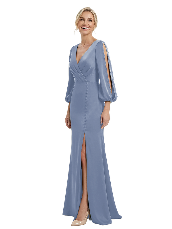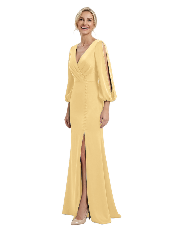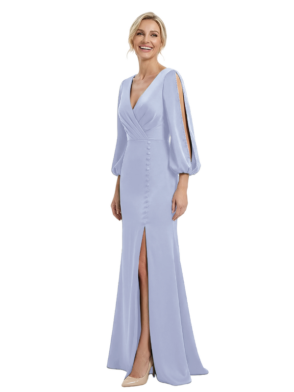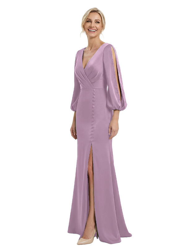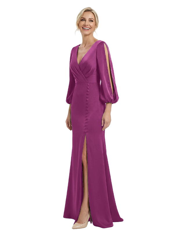 Elegant V-Neck Side Slit Lantern Sleeves Satin Mother Of The Bride Dress With Button