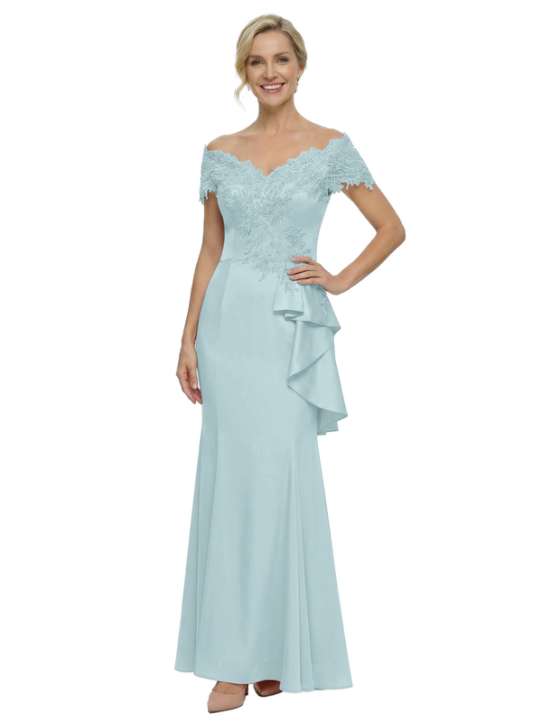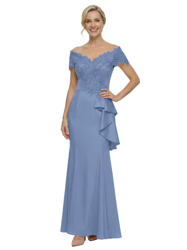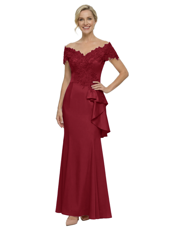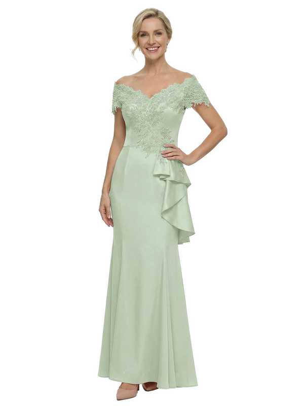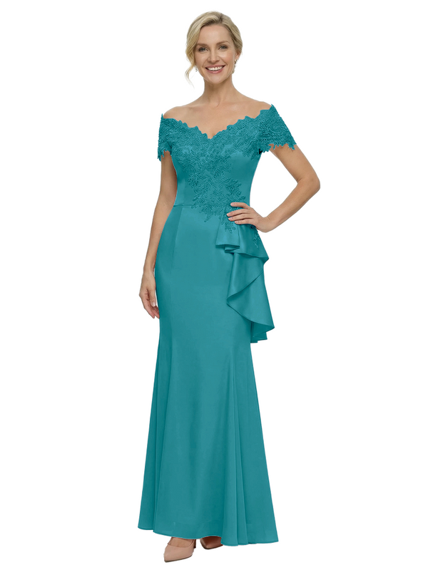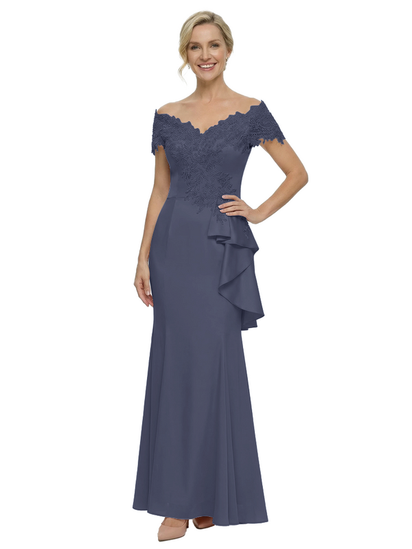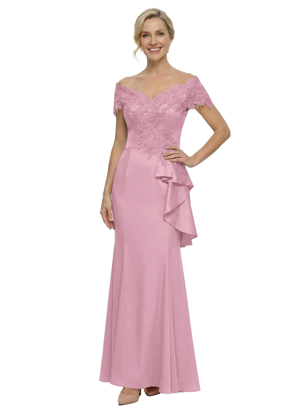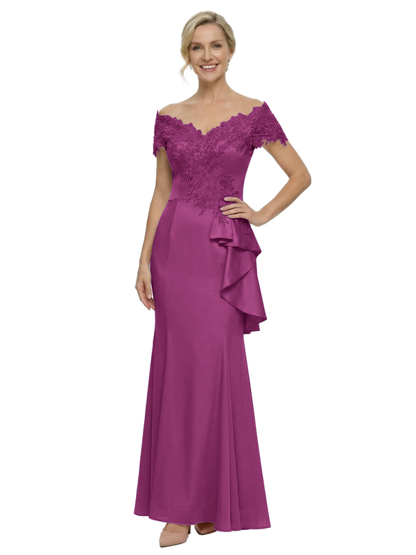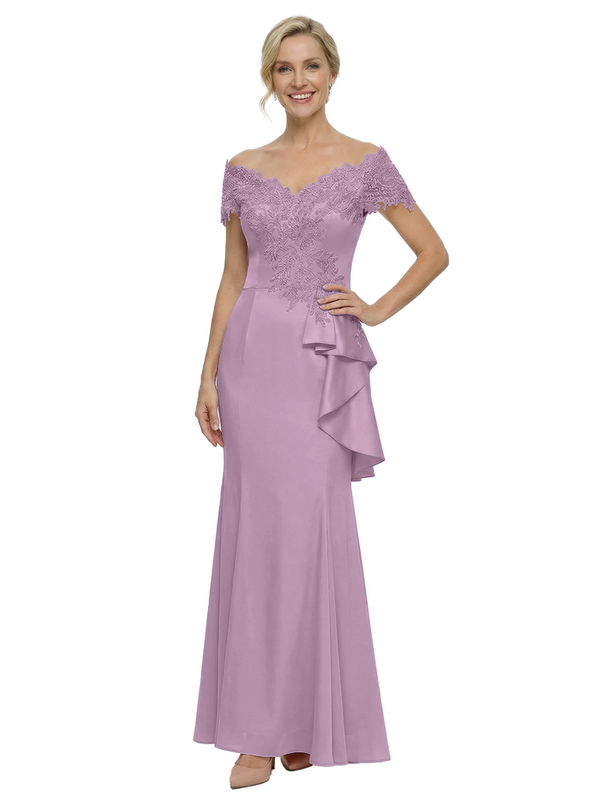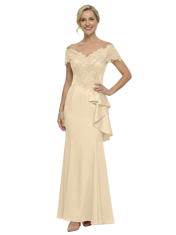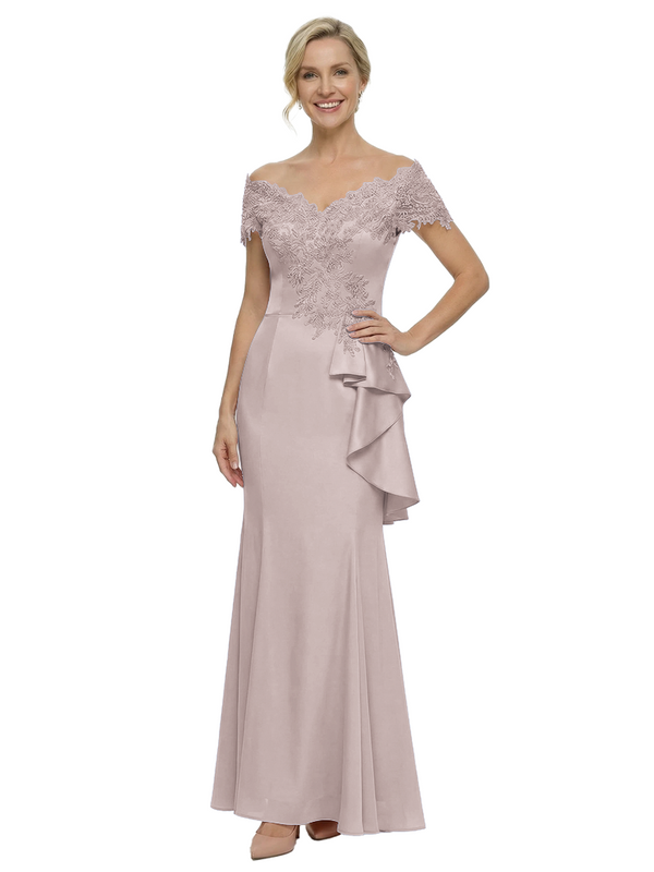 Glam Off Shoulder Short Sleeve Mother of The Groom Dress Fancy Mermaid Satin Maxi Gown with Lace Embellishments