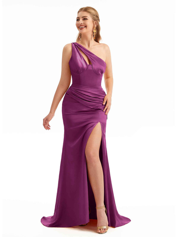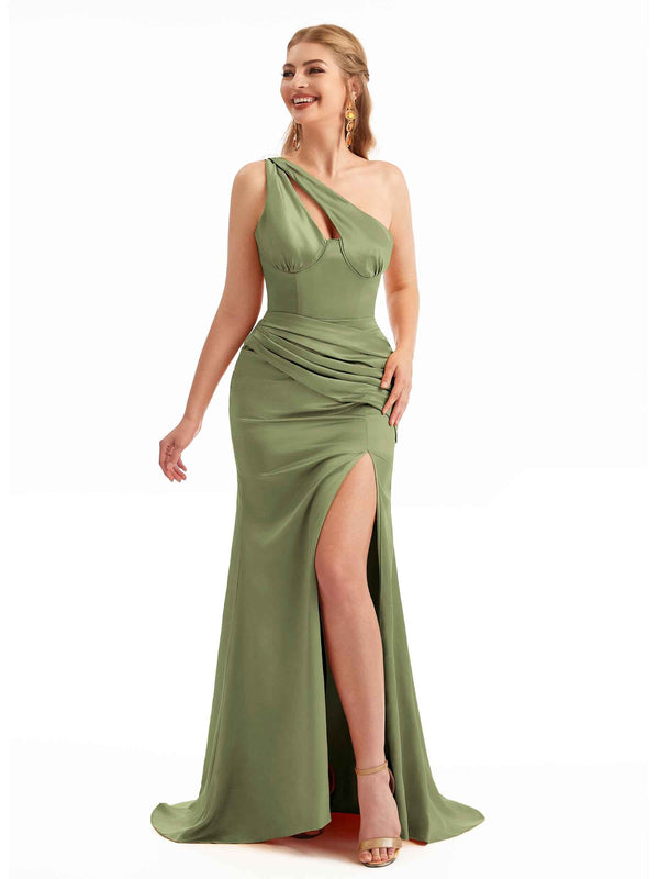 Silky Satin One Shoulder Boho Bridesmaid Dresses Asymmetrical Cutout