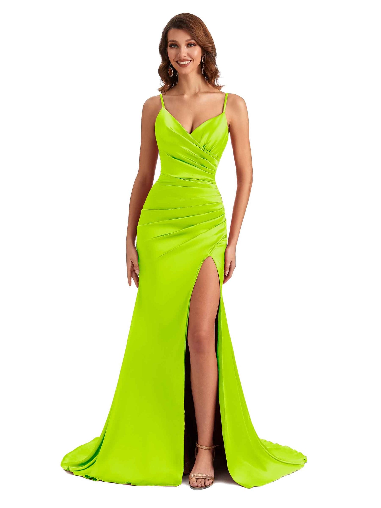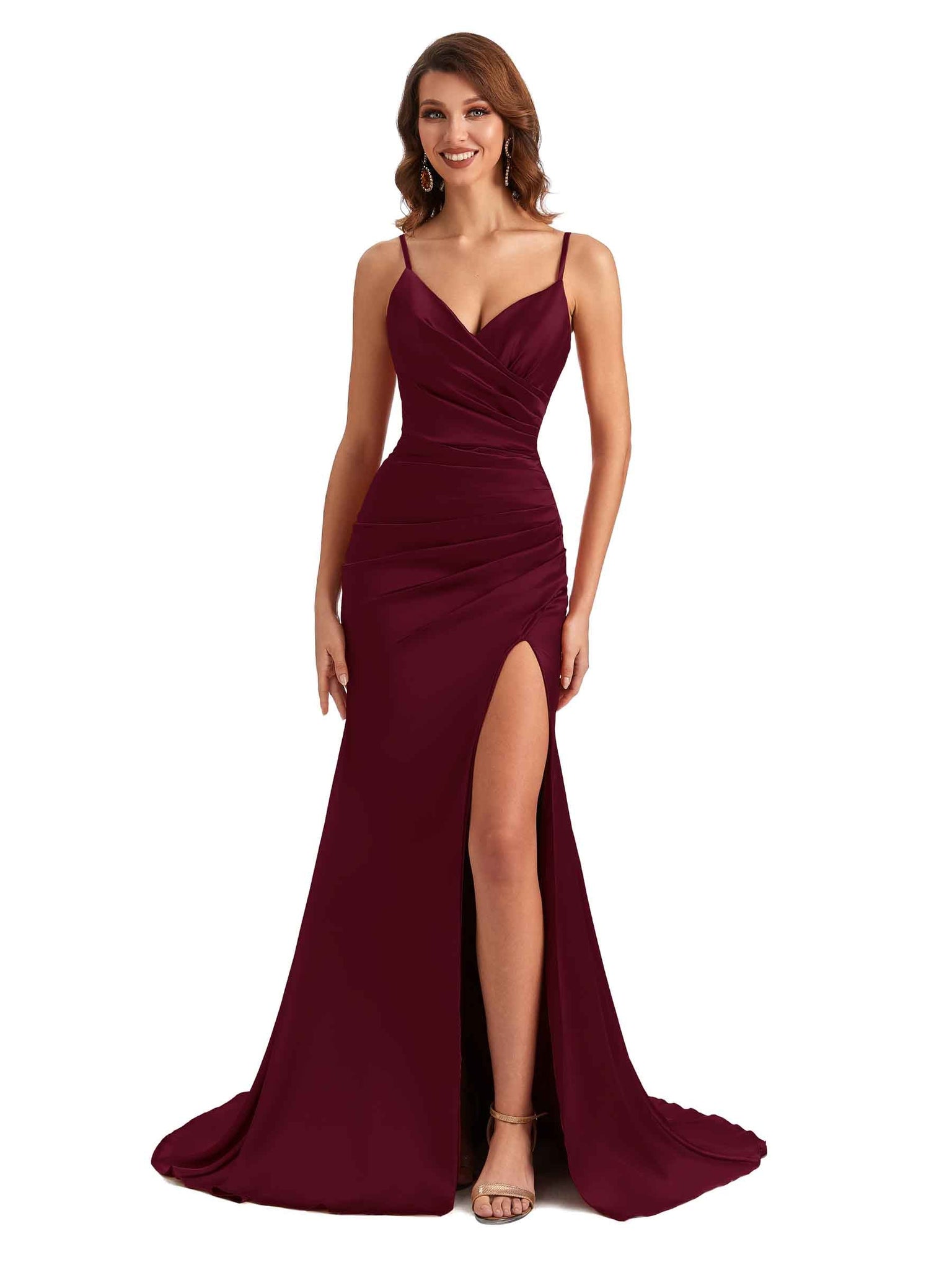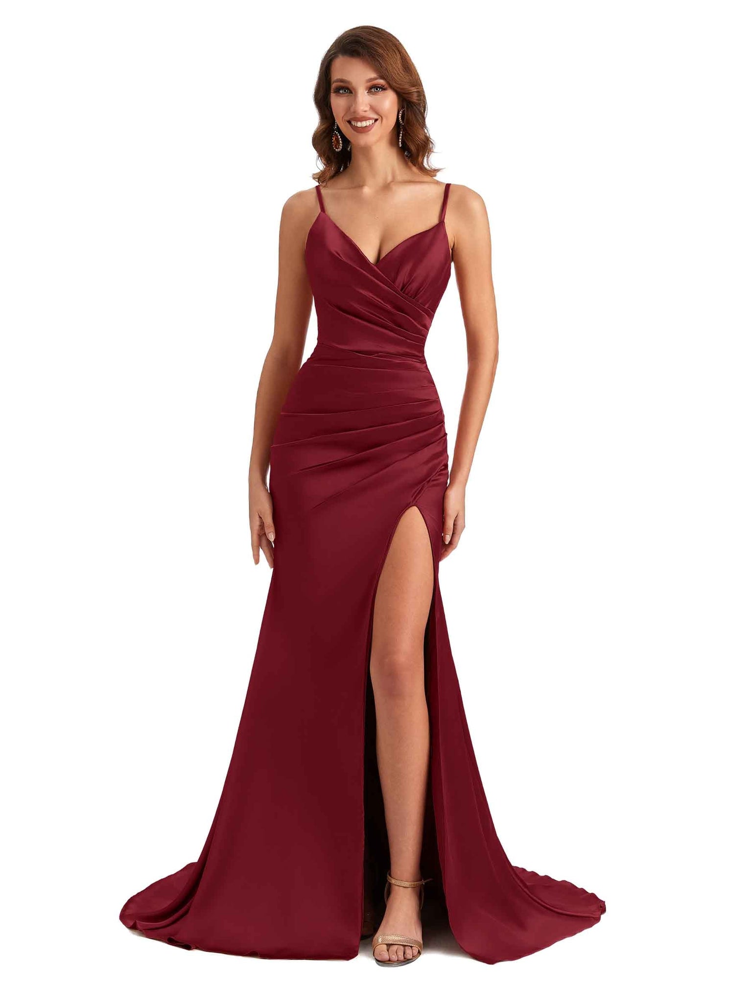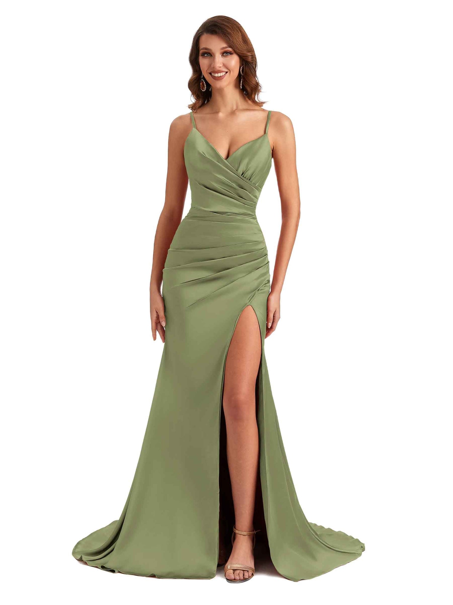 Sexy Mermaid Side Slit Spaghetti Straps V-neck Silky Satin Wedding Party Guest Dresses