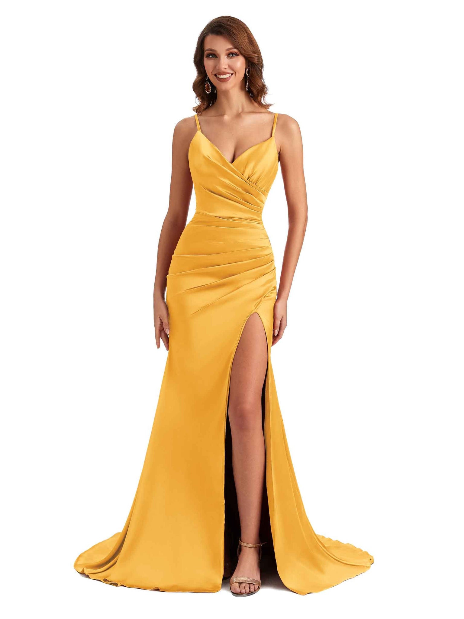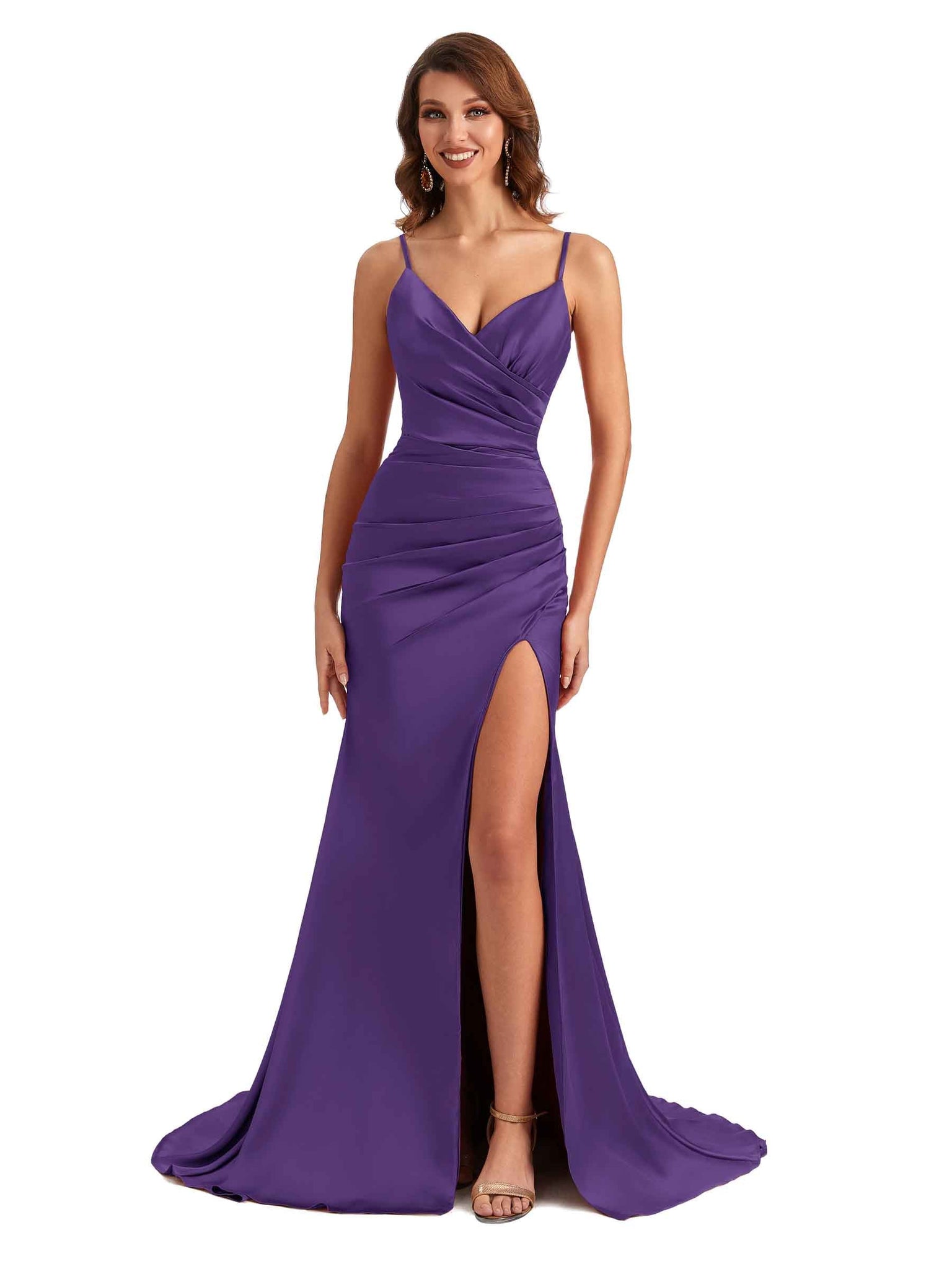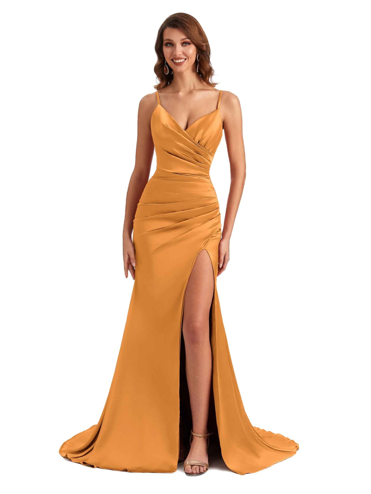 Sexy Mermaid Side Slit Spaghetti Straps V-neck Silky Satin Wedding Party Guest Dresses