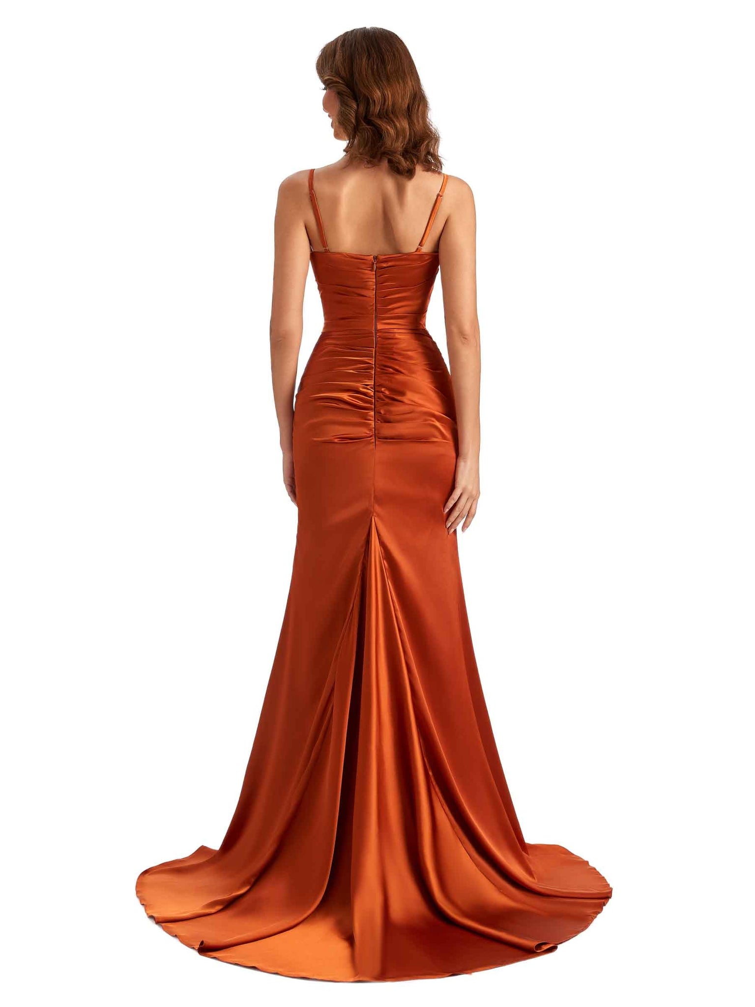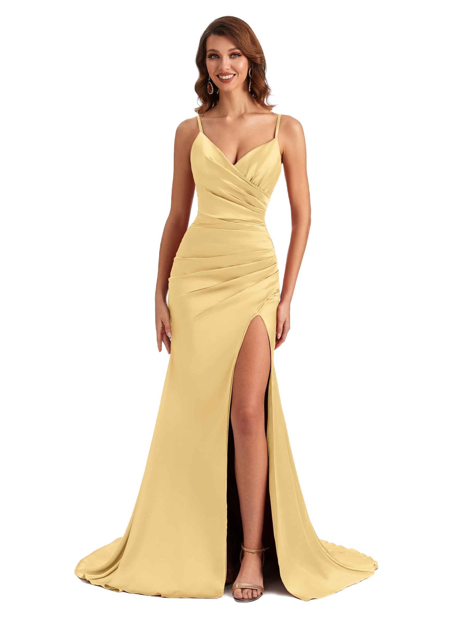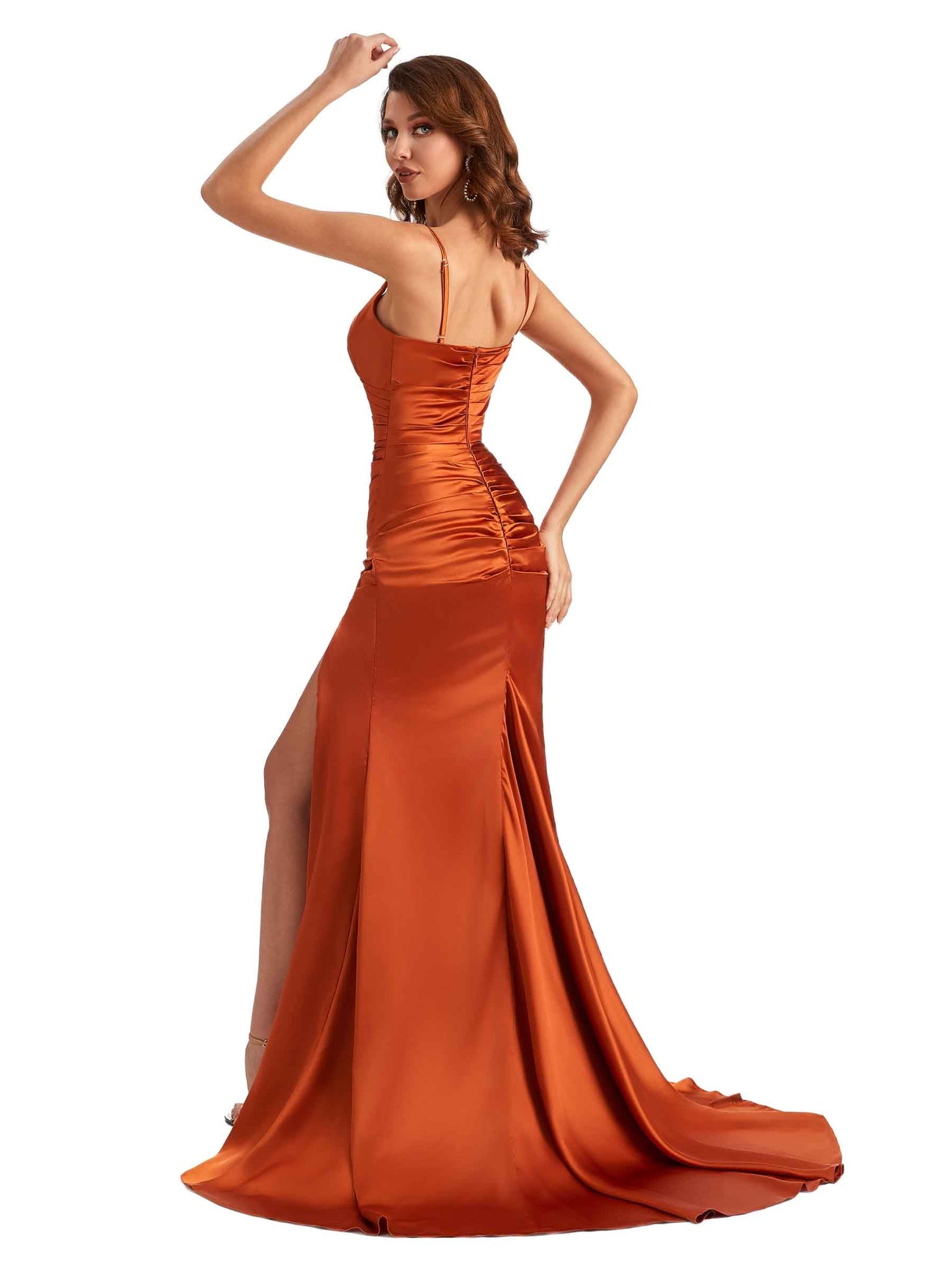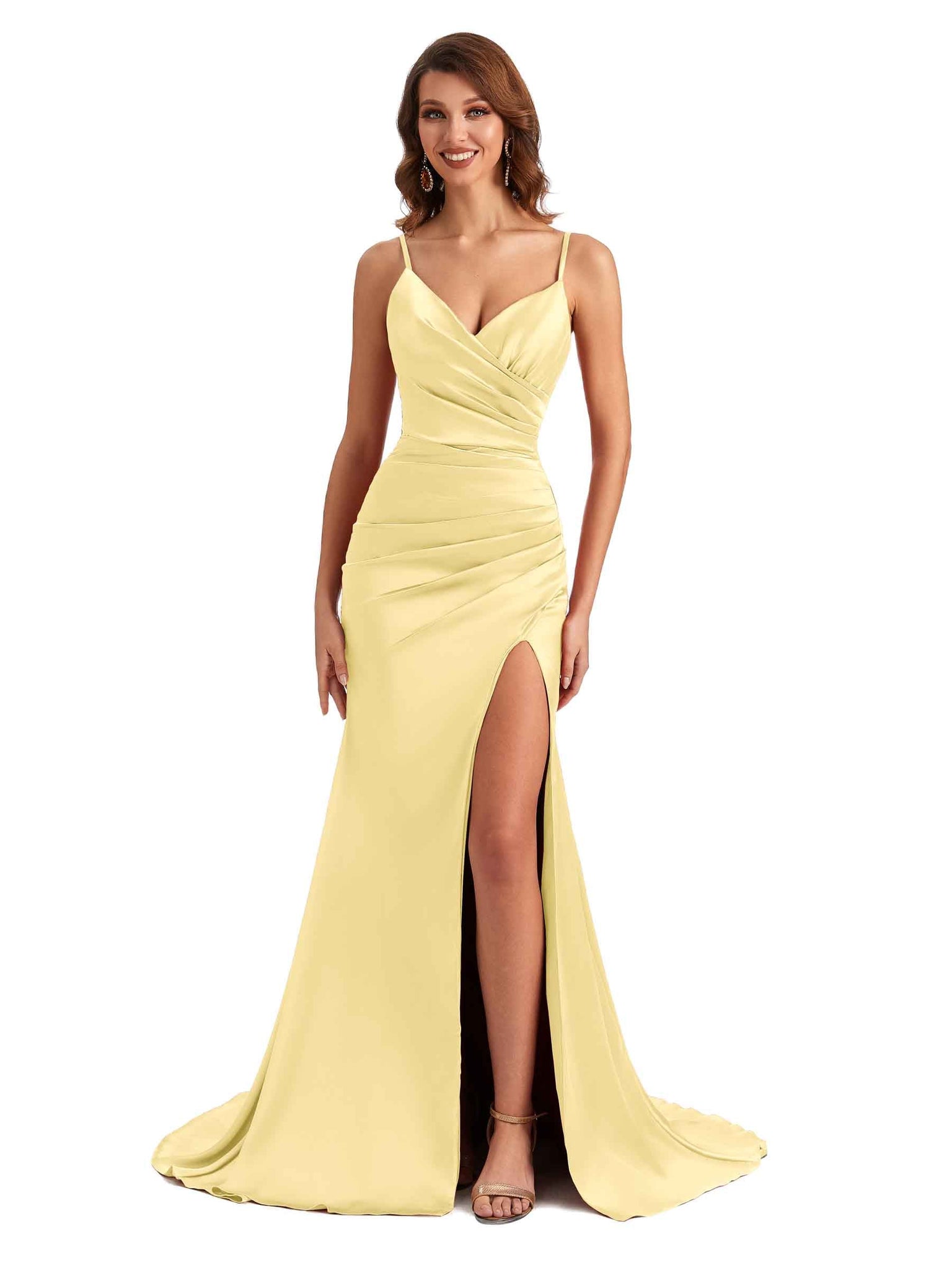 Sexy Mermaid Side Slit Spaghetti Straps V-neck Silky Satin Wedding Party Guest Dresses
