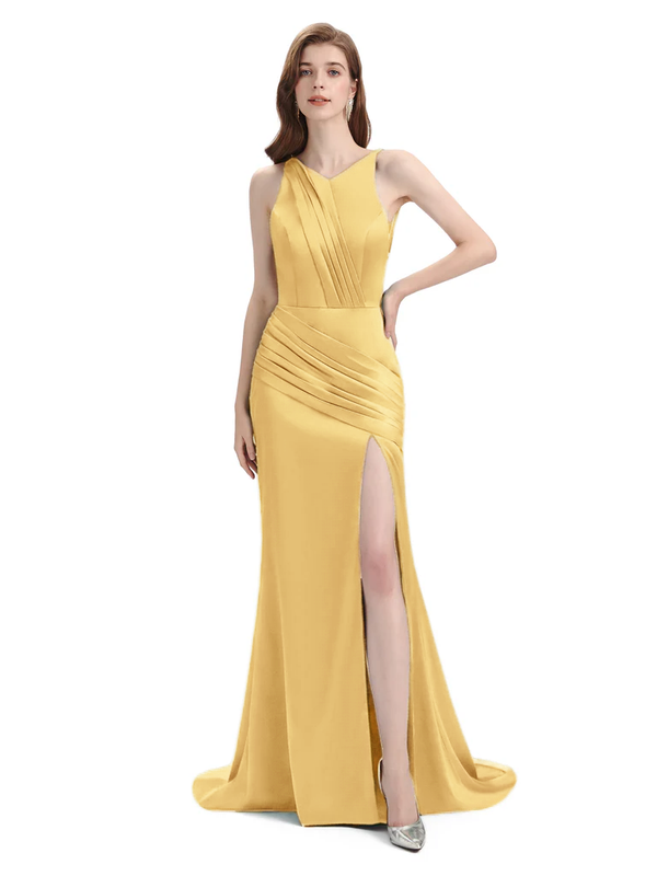 Sexy Backless Mermaid Side Slit Soft Satin Floor-Length Mermaid Bridesmaid Dresses