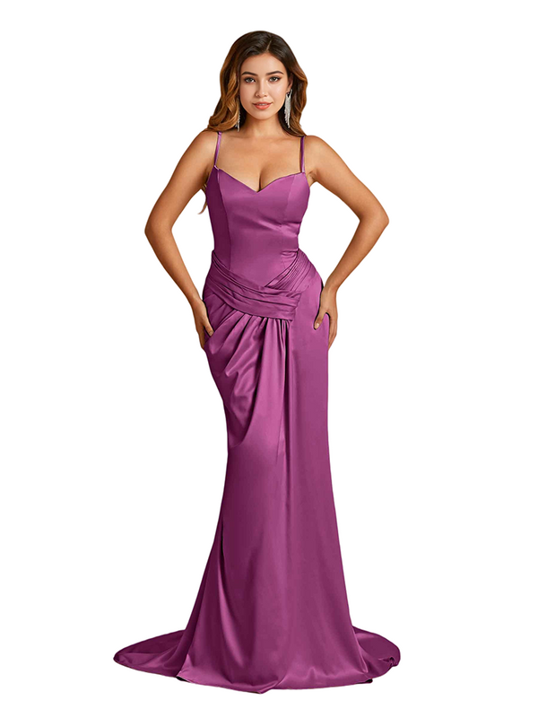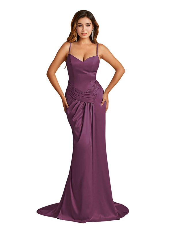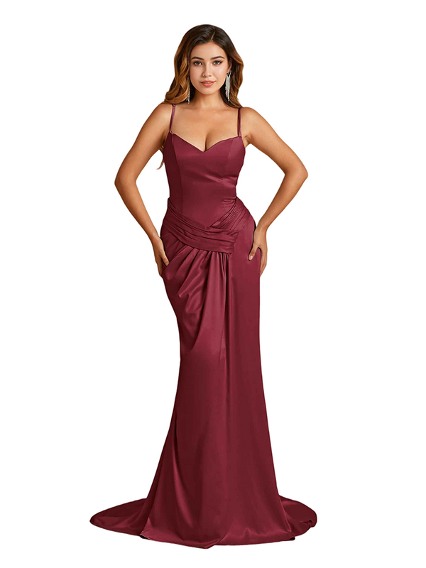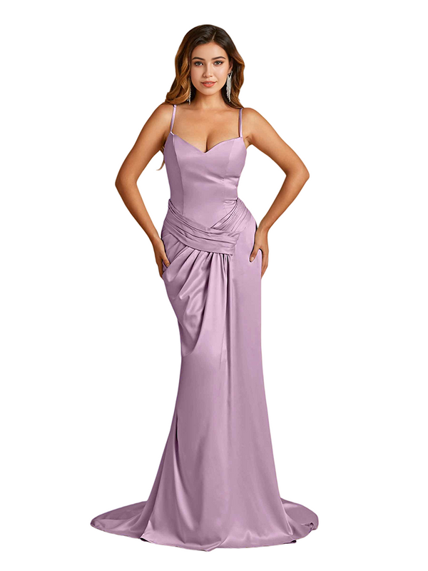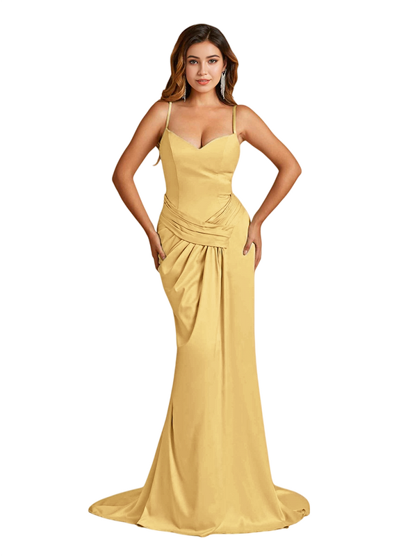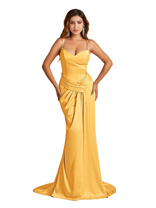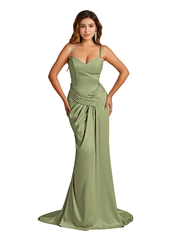 Elegant Spaghetti Straps Mermaid Ruched Satin Long Bridesmaid Dresses Online