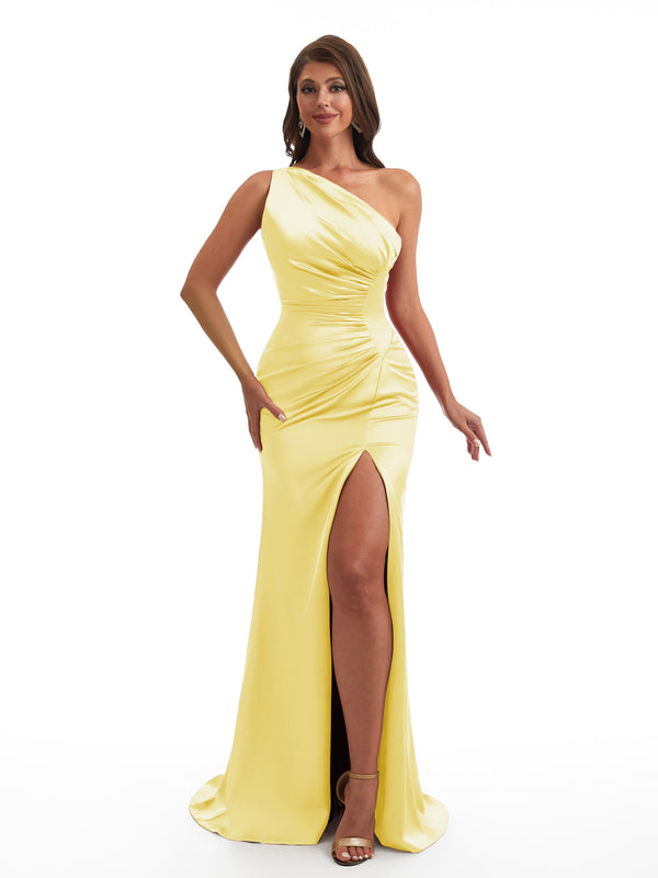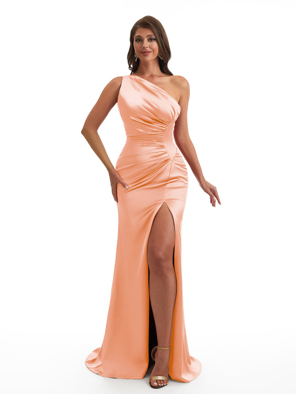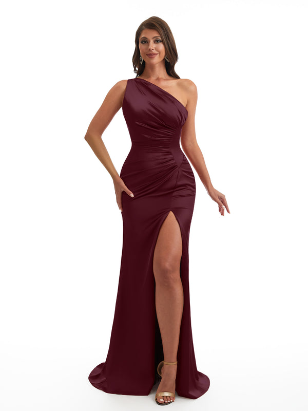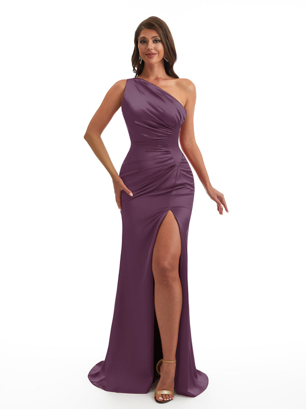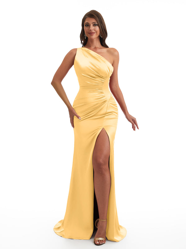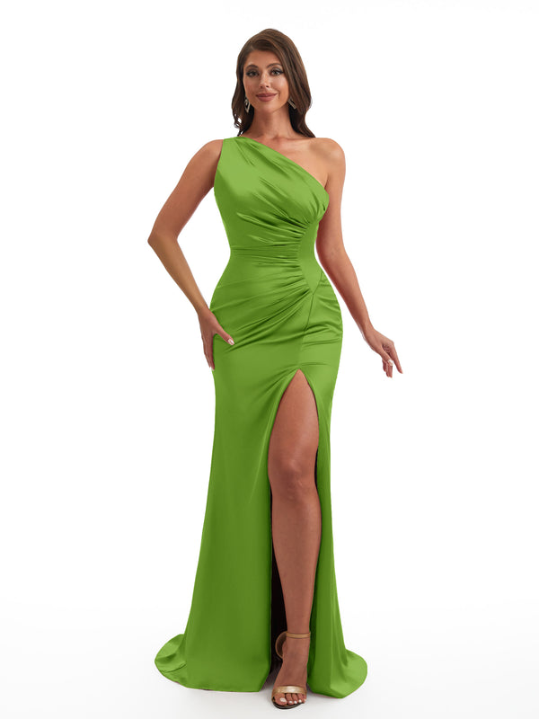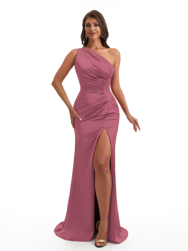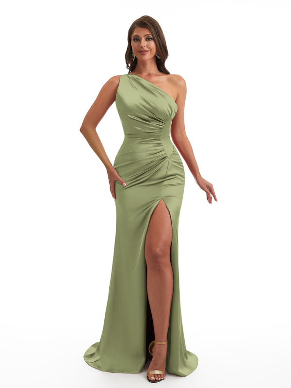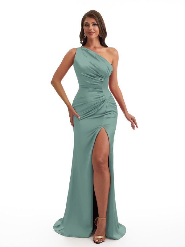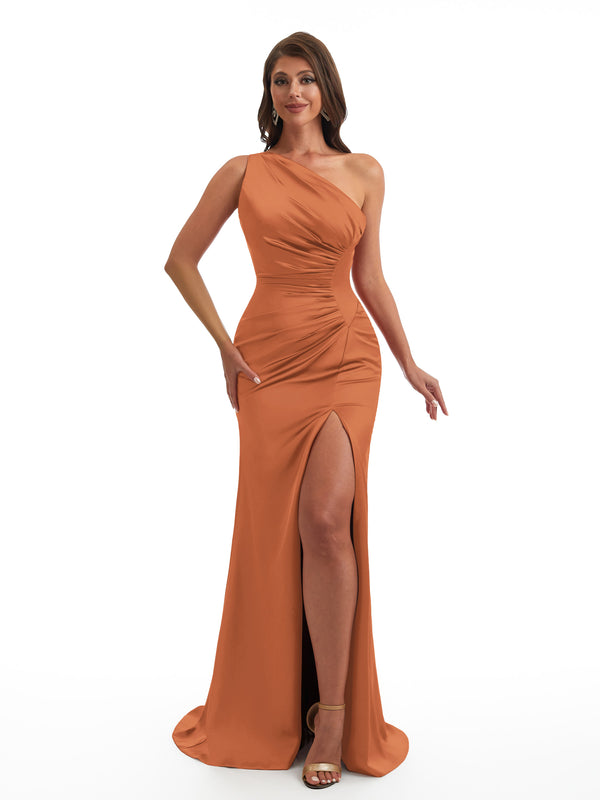 Sexy One Shoulder Mermaid Soft Satin Unique Long Bridesmaid Dresses Slit