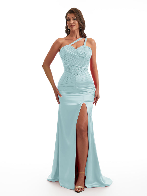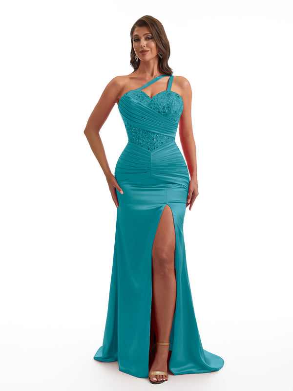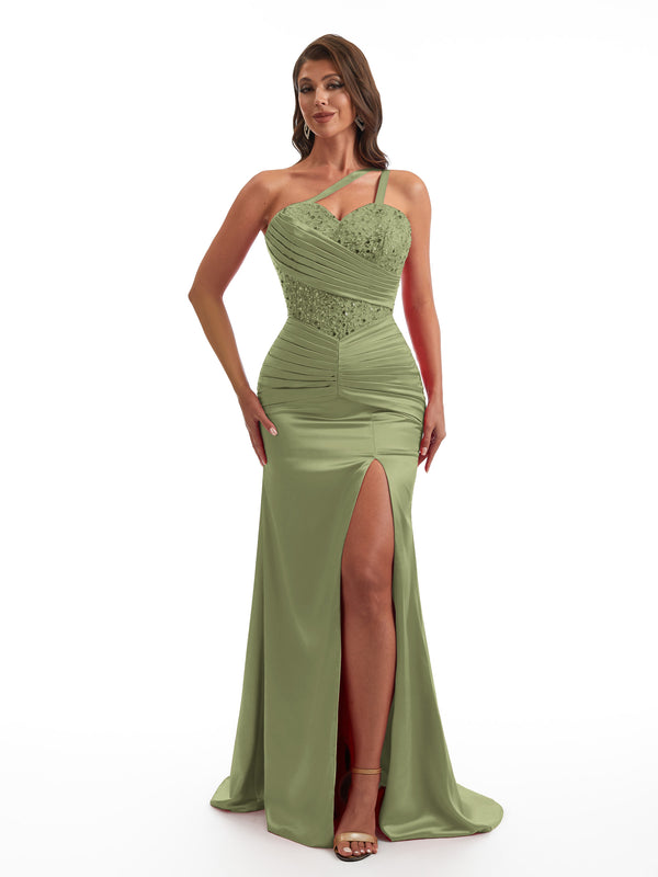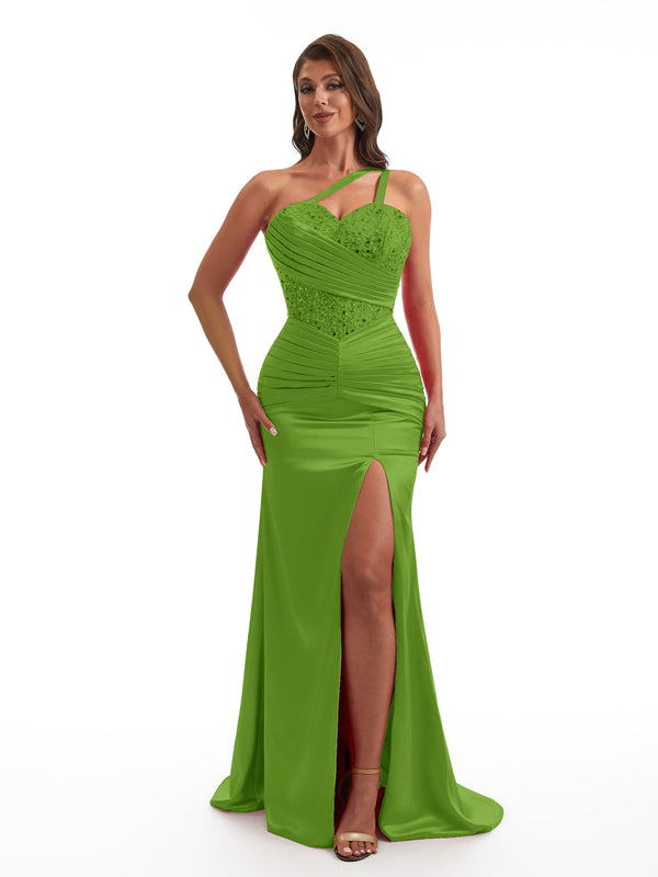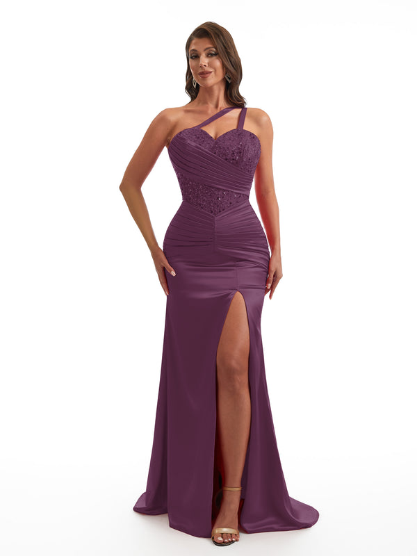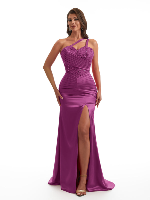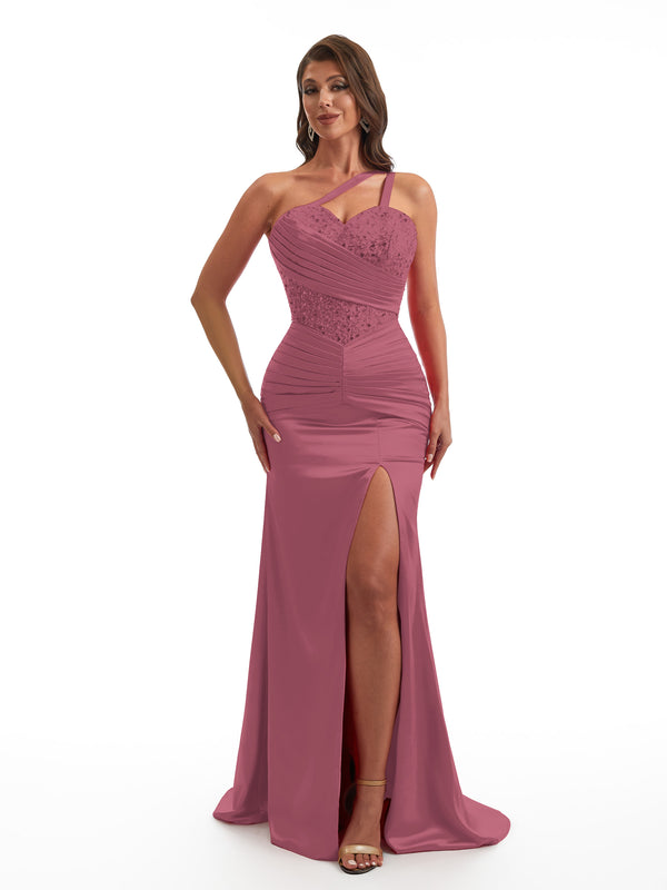 Sexy One Shoulder Side Slit Mermaid Satin Ruched Unique Long Bridesmaid Dresses