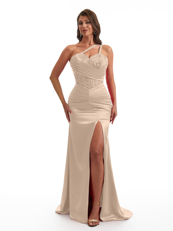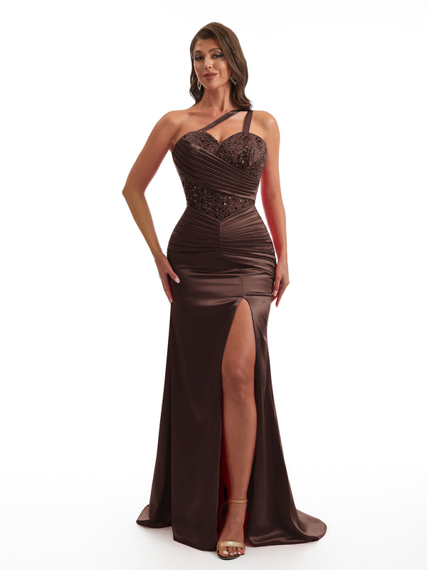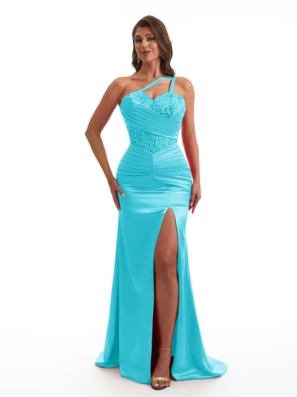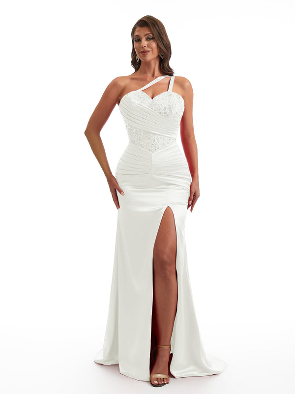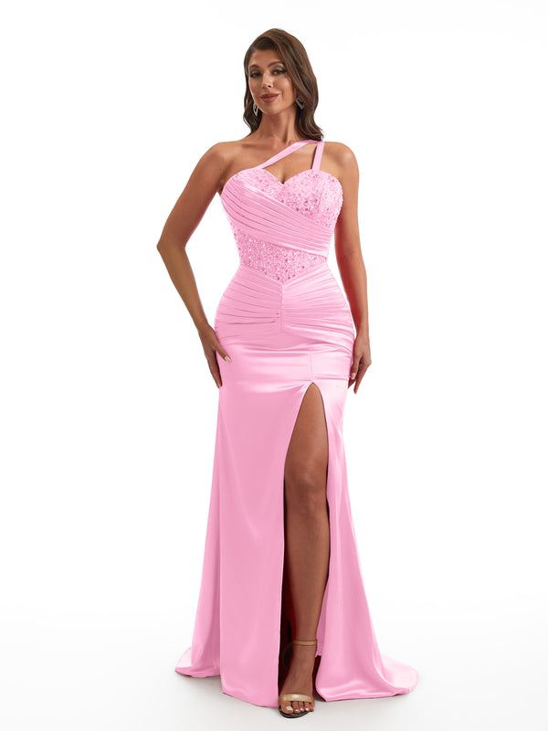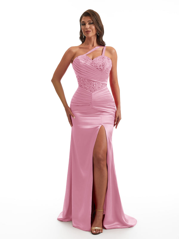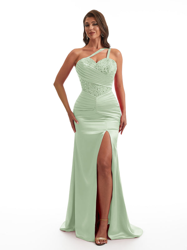 Sexy One Shoulder Side Slit Mermaid Satin Ruched Unique Long Bridesmaid Dresses