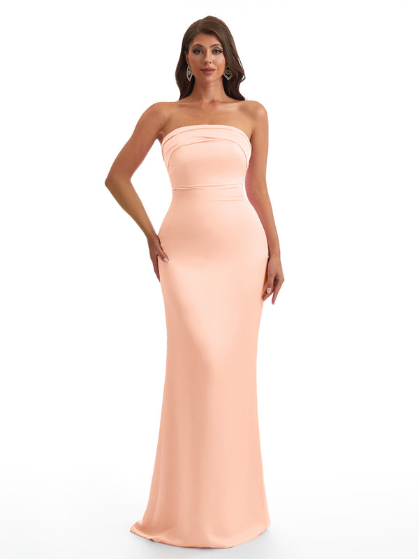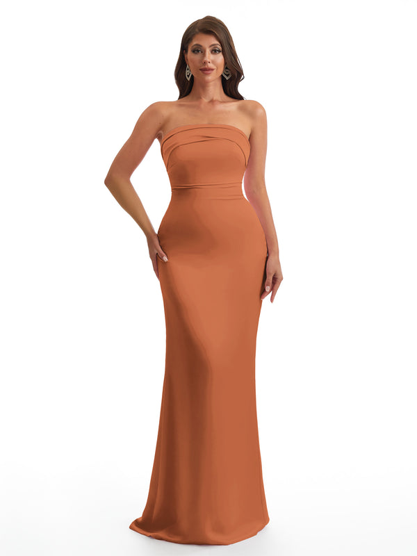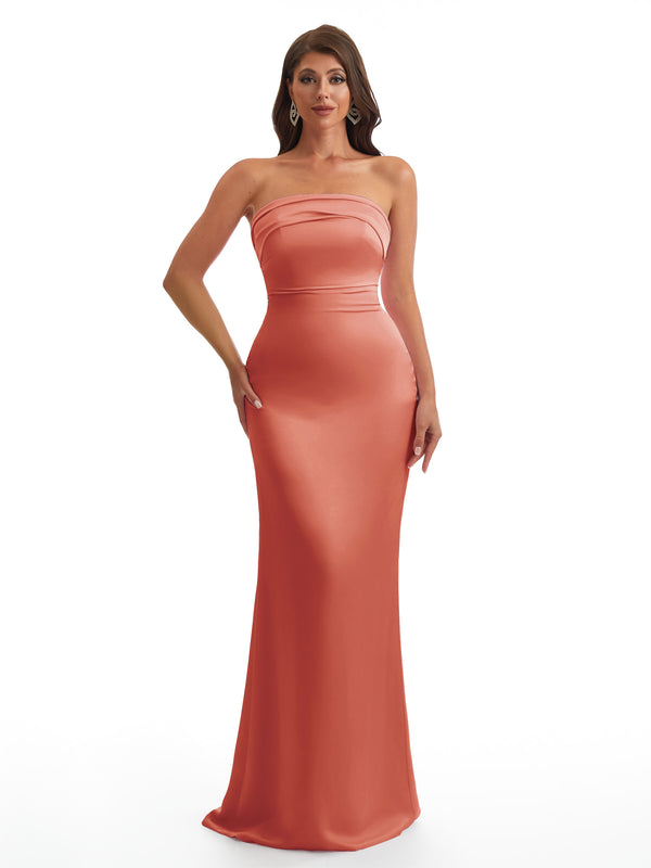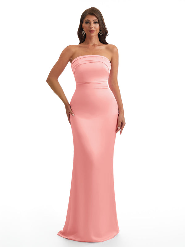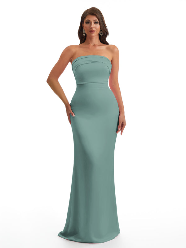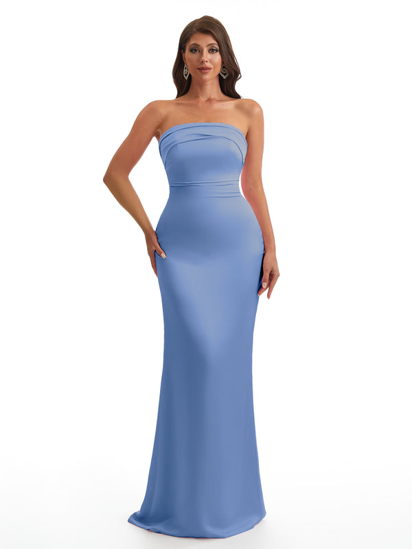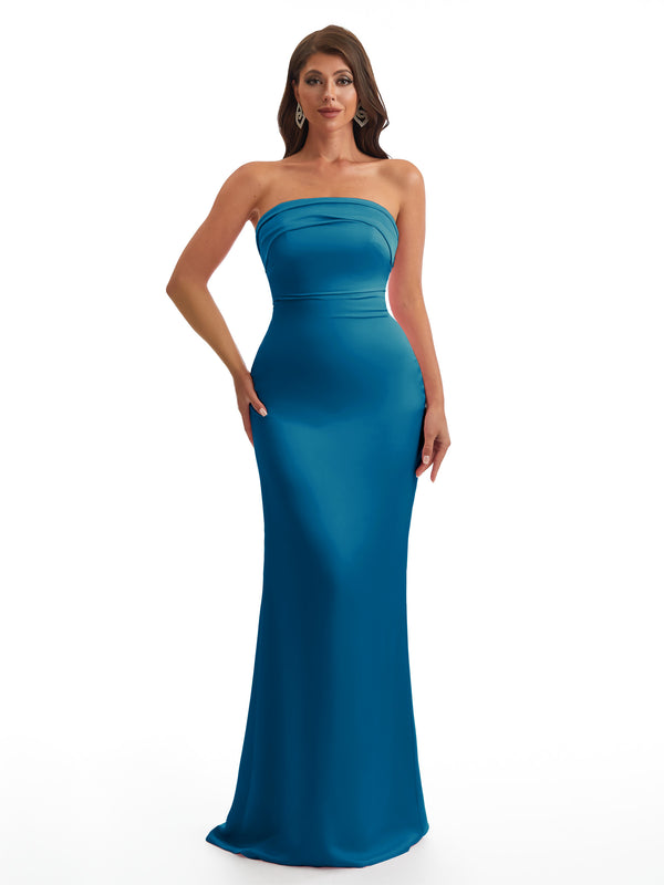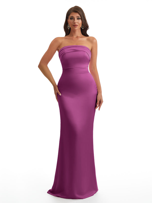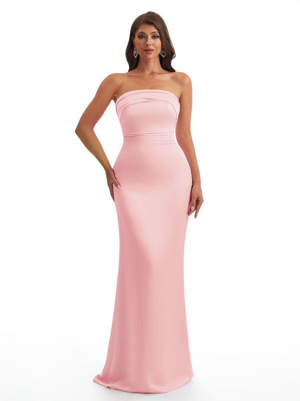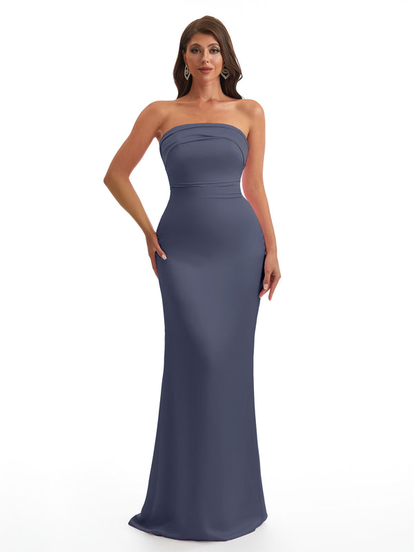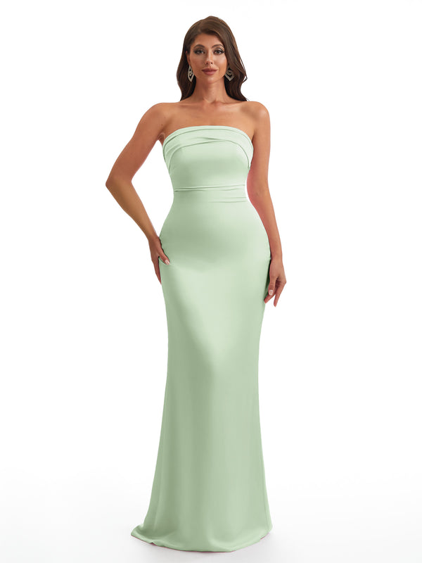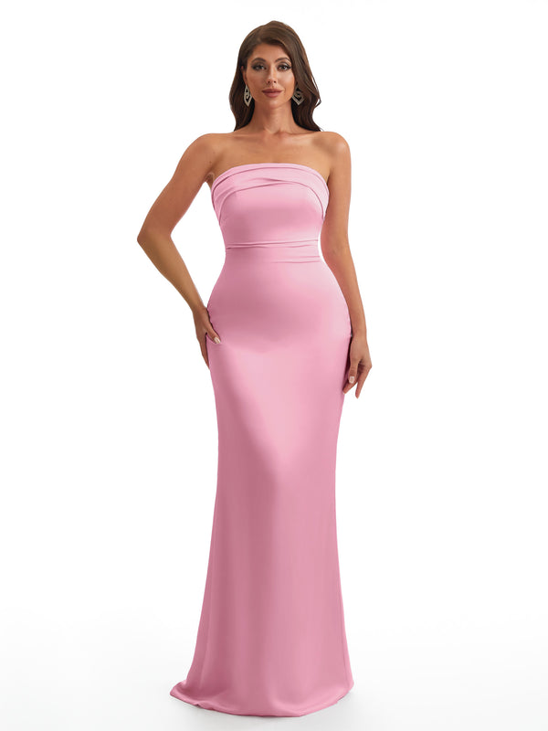 Simple Strapless Mermaid Silky Satin Long Bridesmaid Dresses With Bow Knot