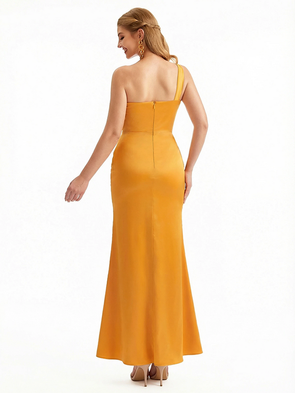 Elegant Mermaid One Shoulder Ruched Silky Satin Long Formal Dresses Side Slit