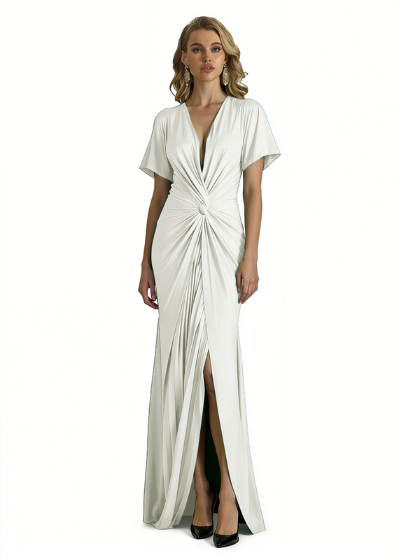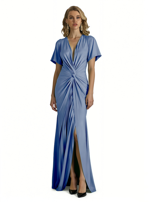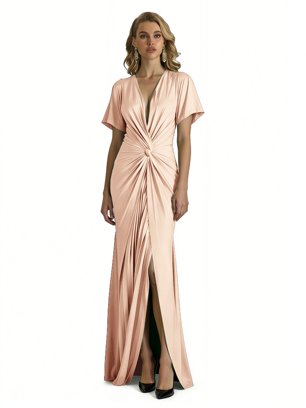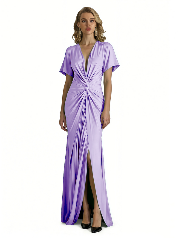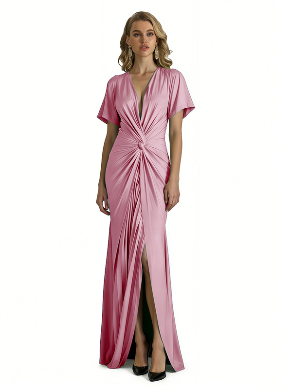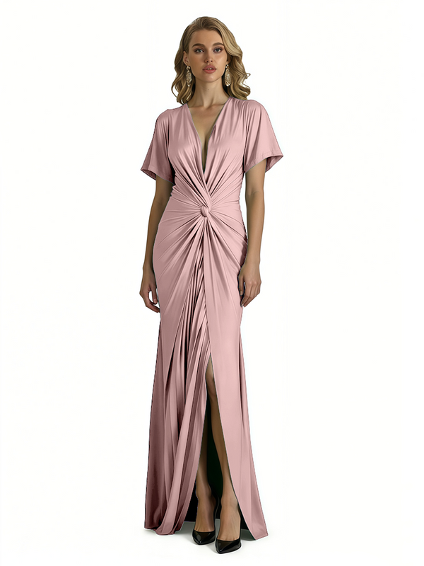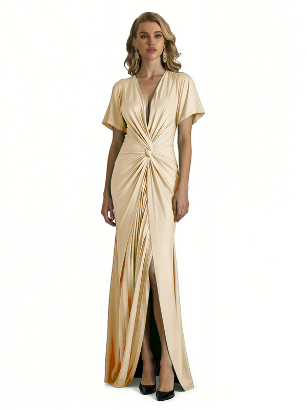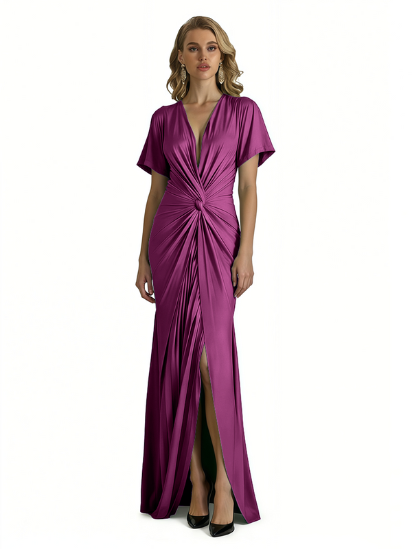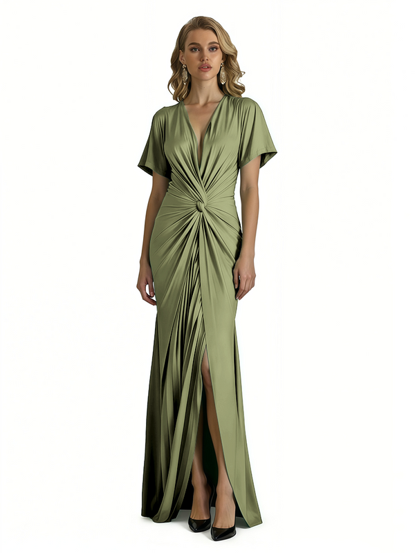 Elegant V-Neck Short Sleeves Silky Satin Side Slit Mermaid Long Formal Evening Dresses