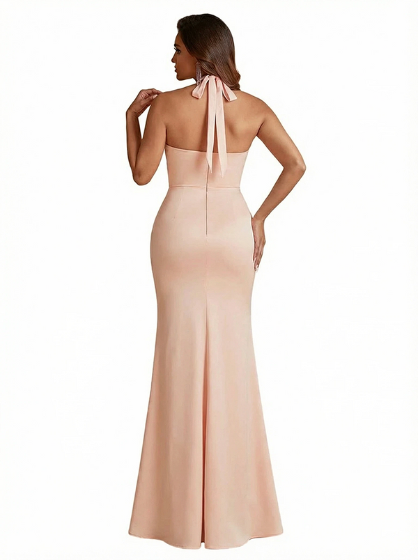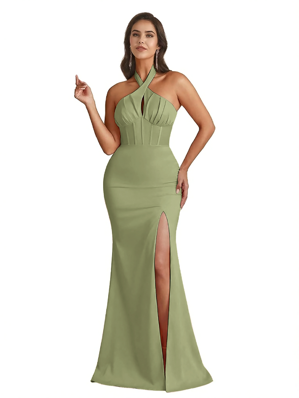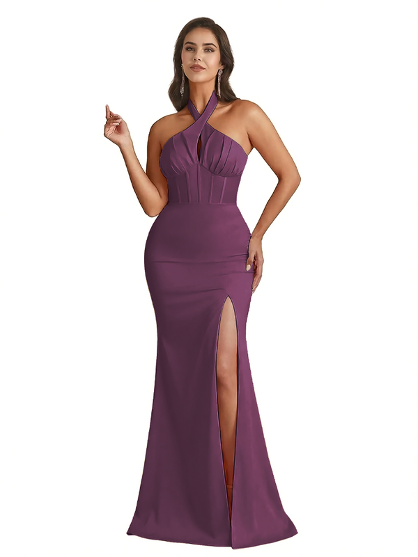Sexy Halter Neck Side Slit Mermaid Ruched Satin Long Formal Dresses For Women