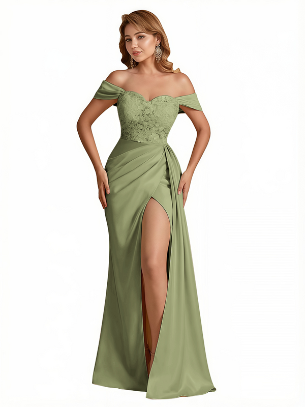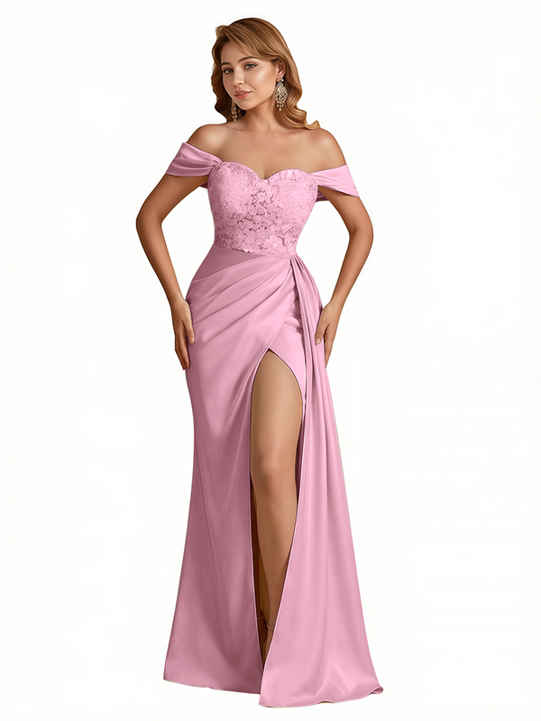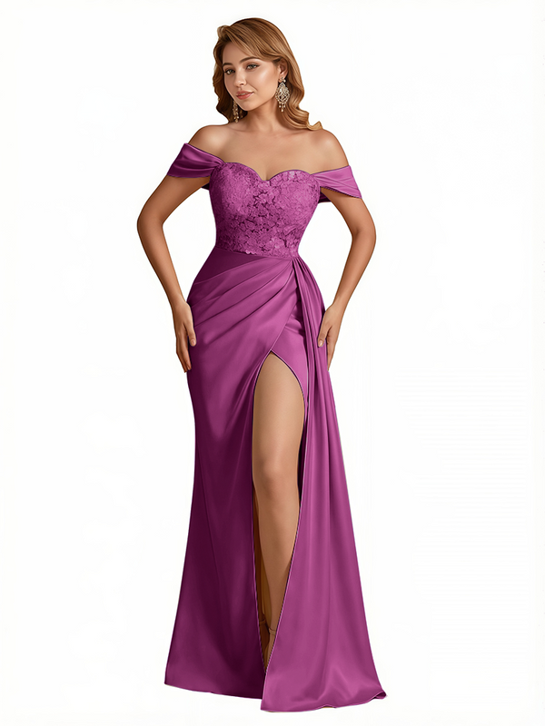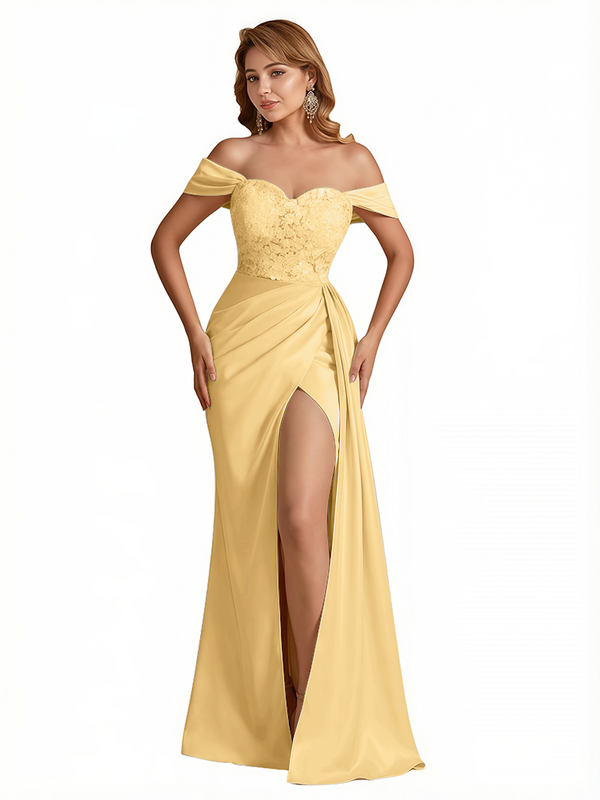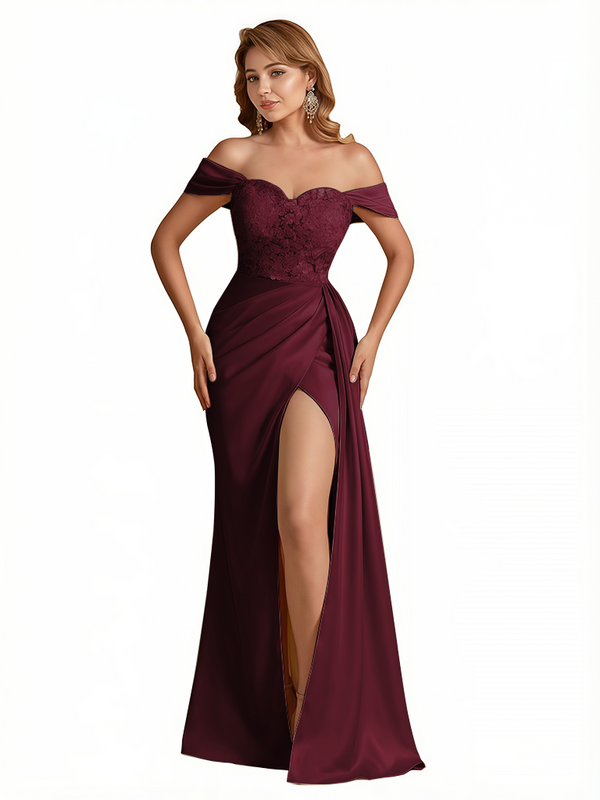 Sexy Lace Appliques Off The Shoulder Side Slit Mermaid Silky Satin Long Evening Dresses For Women