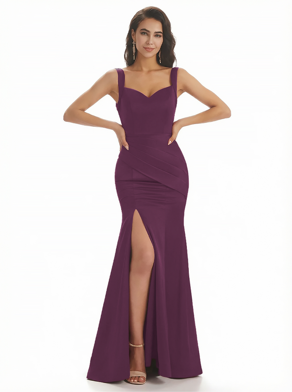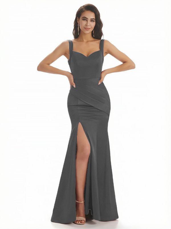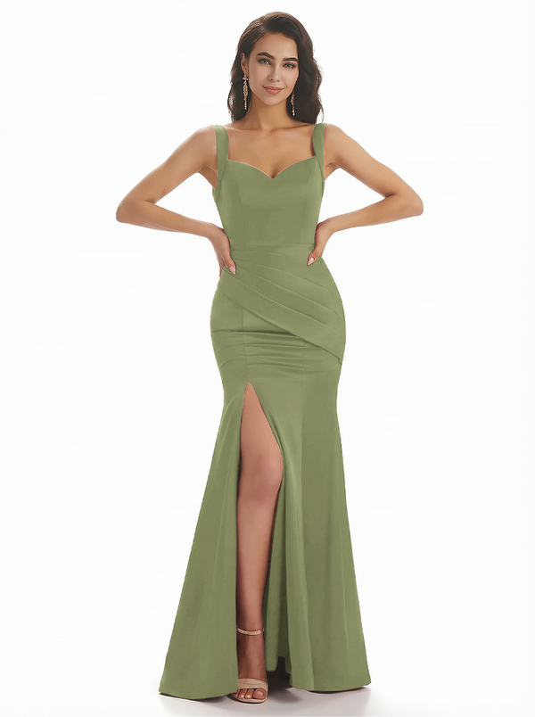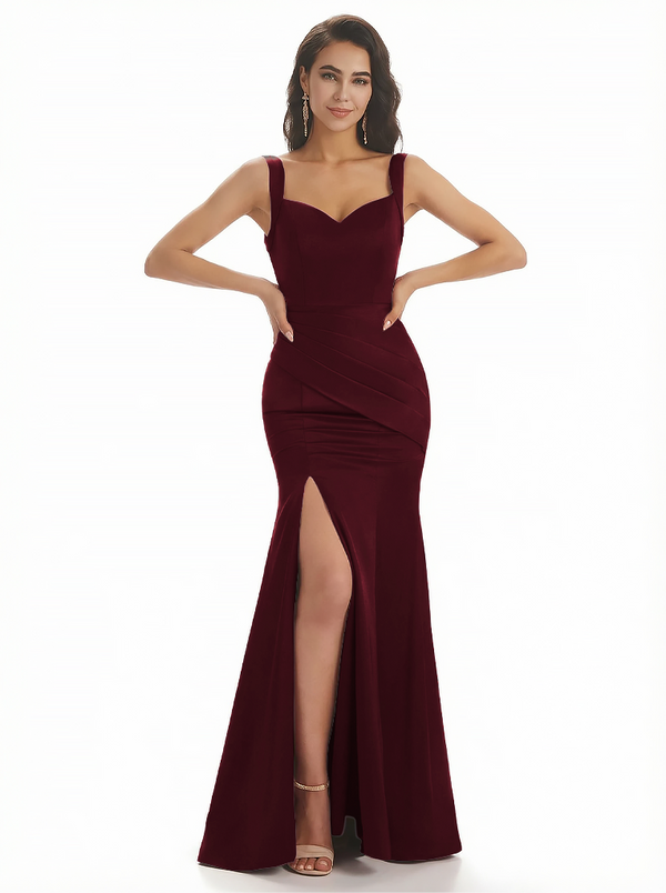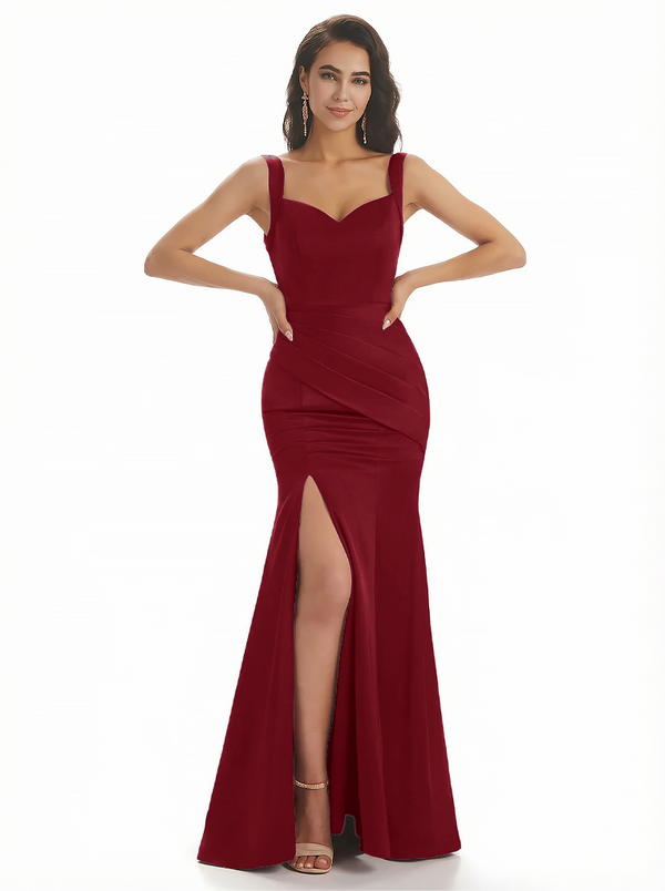 Sexy Straps Mermaid Side Slit Straps Square Silky Satin Long Formal Dresses