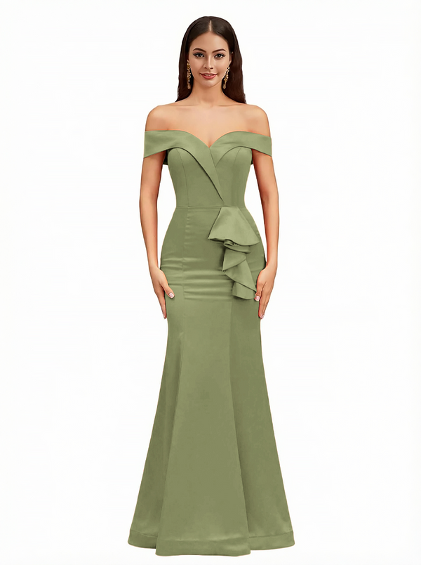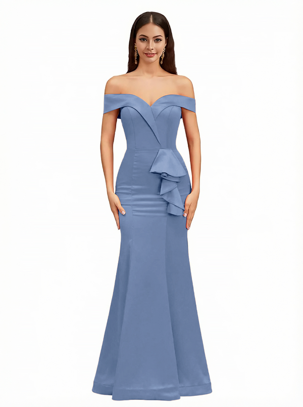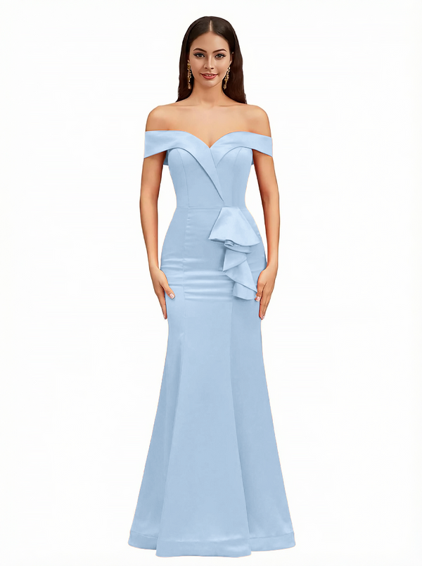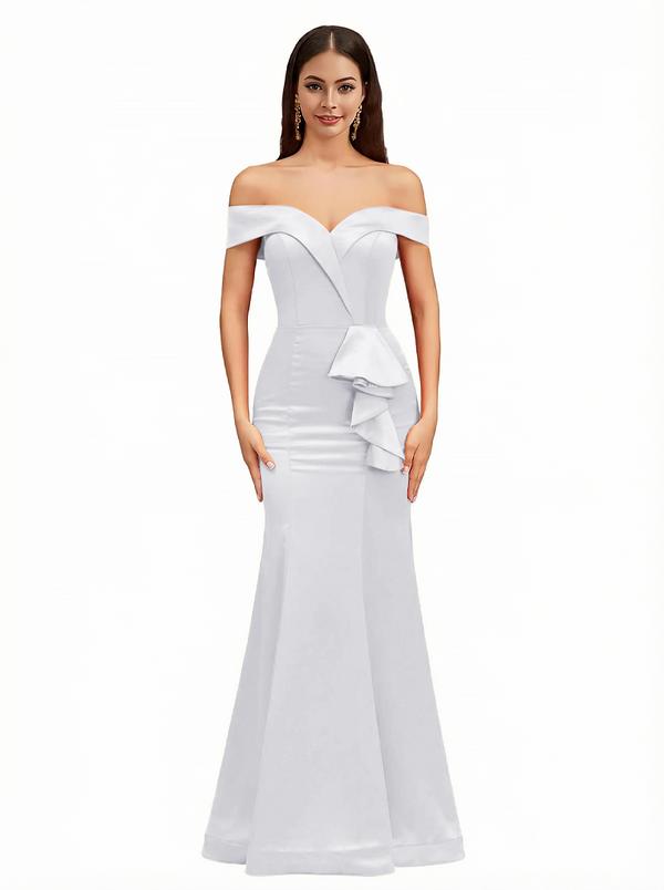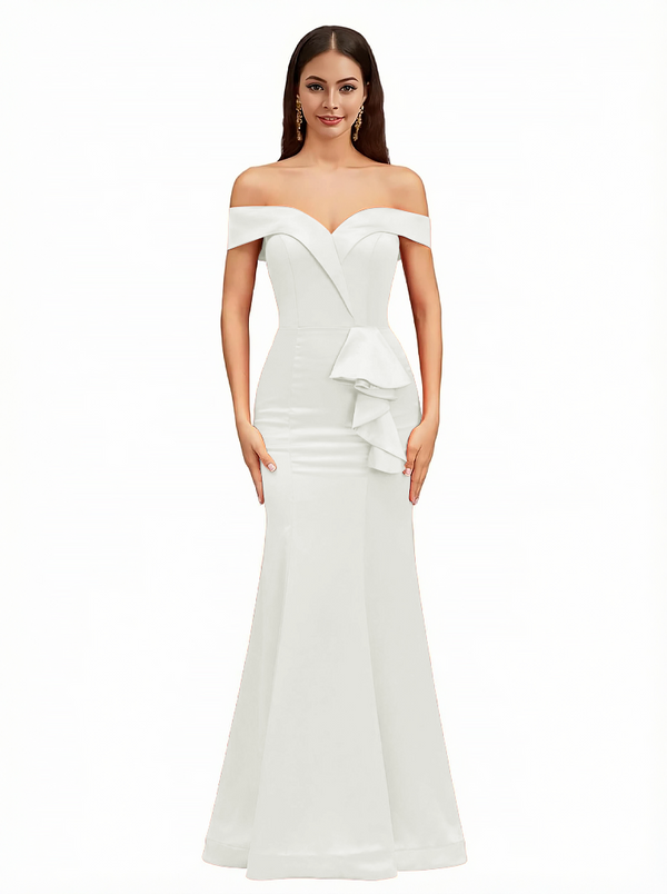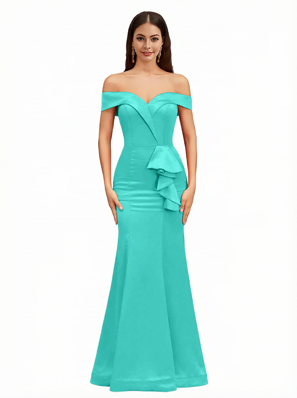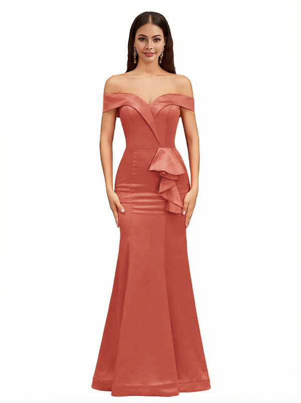 Sexy Off The Shoulder Mermaid Ruffle Silky Satin Long Evening Dresses For Wedding
