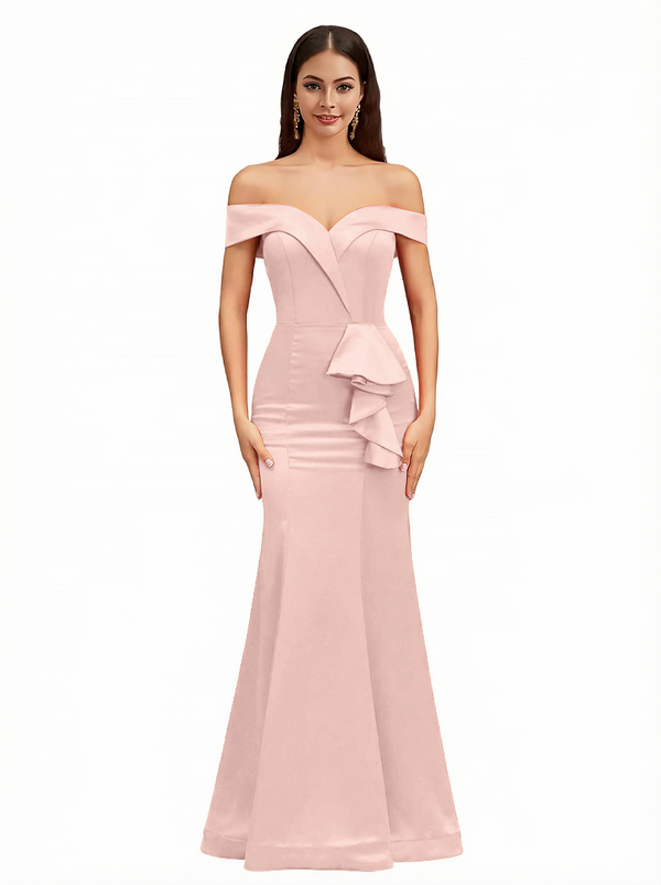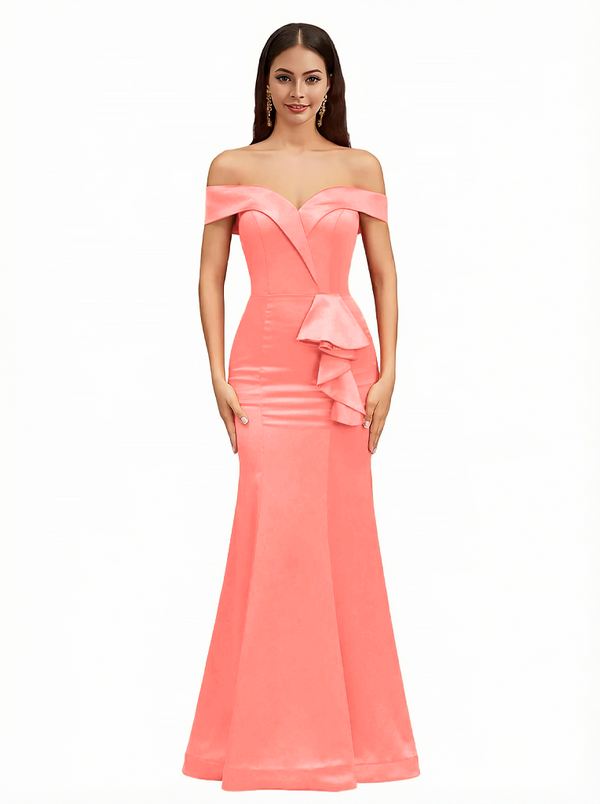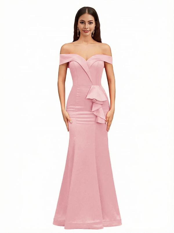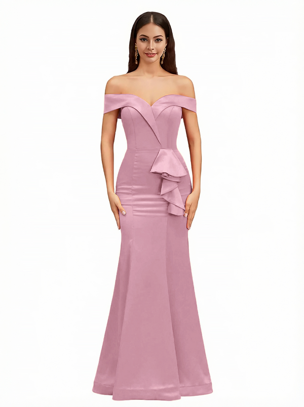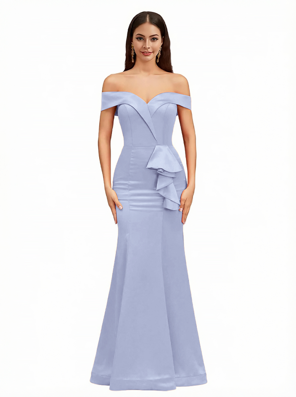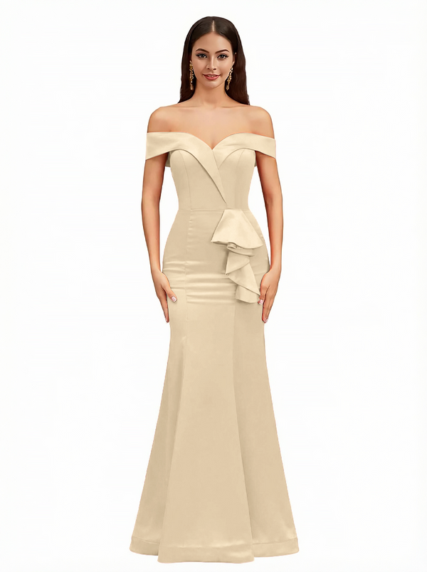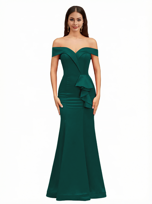 Sexy Off The Shoulder Mermaid Ruffle Silky Satin Long Evening Dresses For Wedding