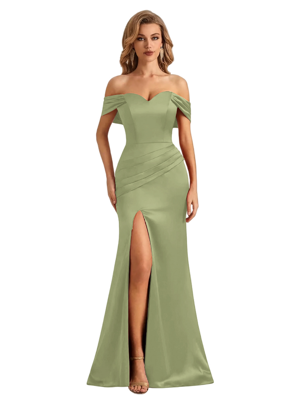 Sexy Off The Shoulder V-Neck Mermaid Silky Satin Long Formal Dresses Side Slit