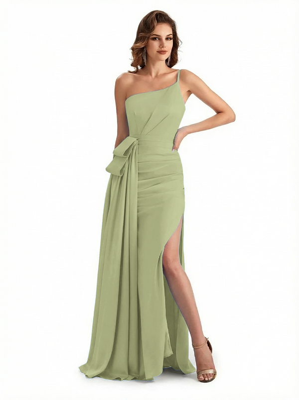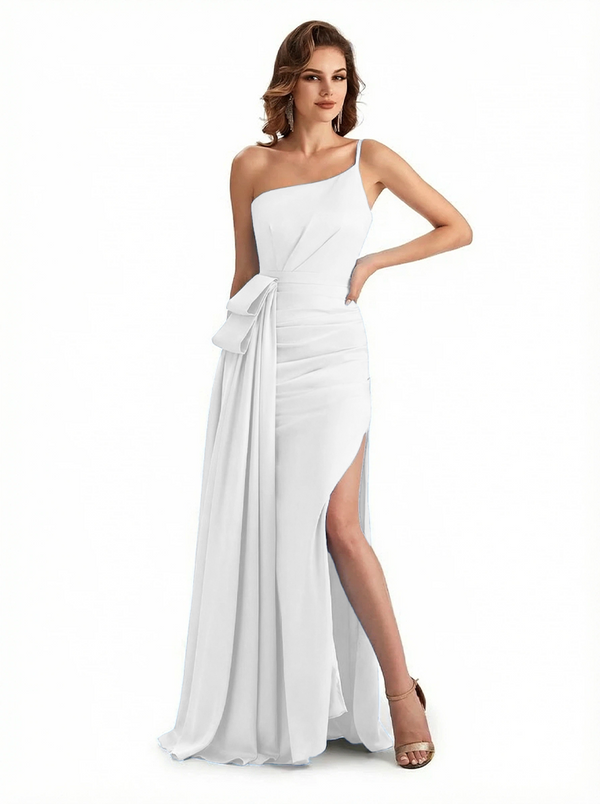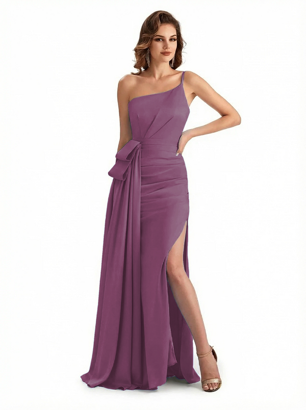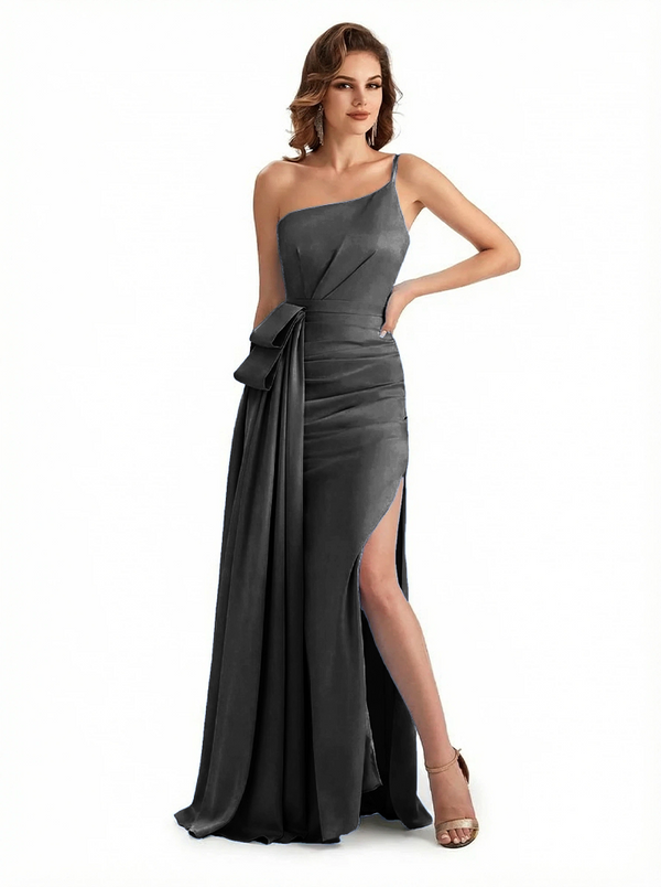Sexy One Shoulder Sleeveless Mermaid Ruched Satin Long Formal Dresses Side Slit