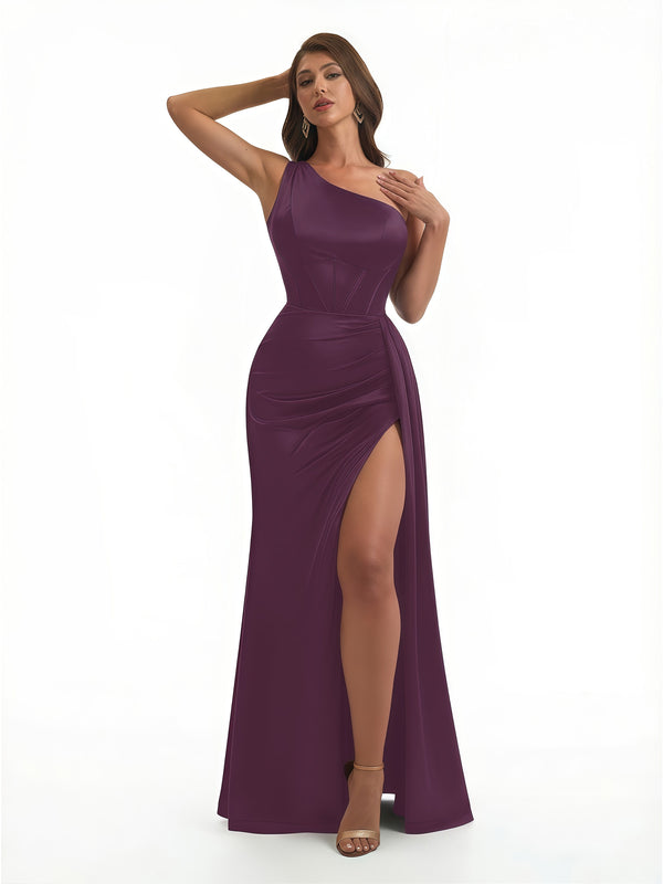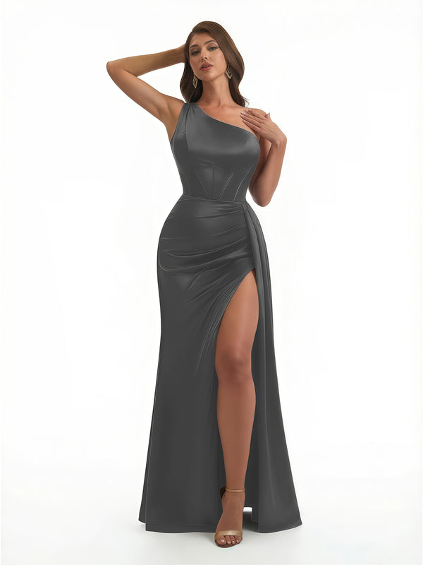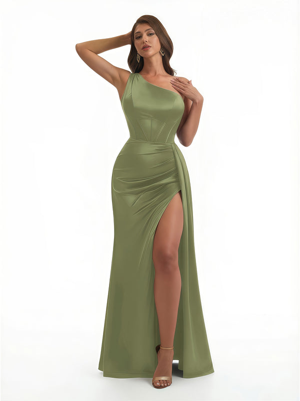 Sexy Ruched Satin One Shoulder Boning Mermaid Long Evening Formal Dresses Side Slit