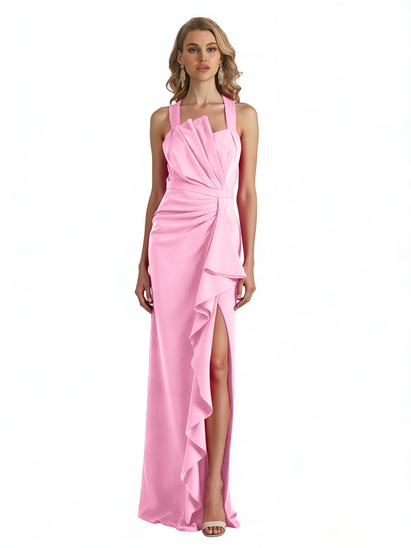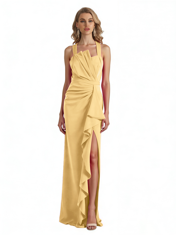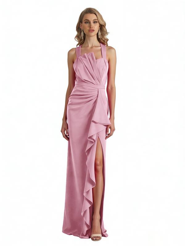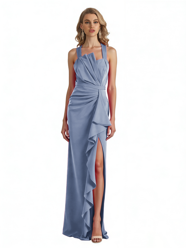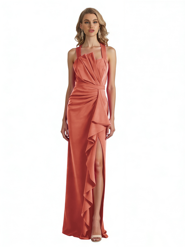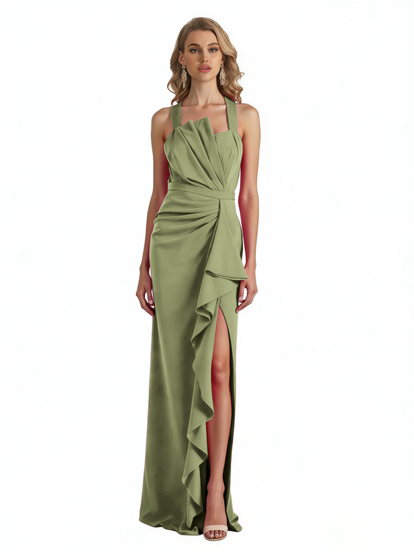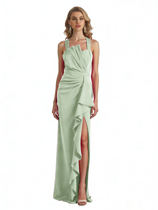 Sexy Spaghetti Straps Silky Satin Ruffle Side Slit Mermaid Long Formal Evening Dresses