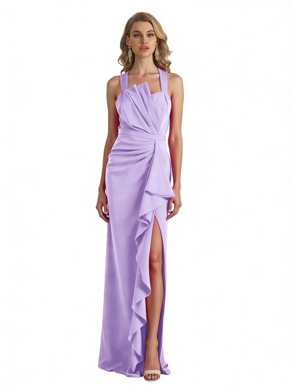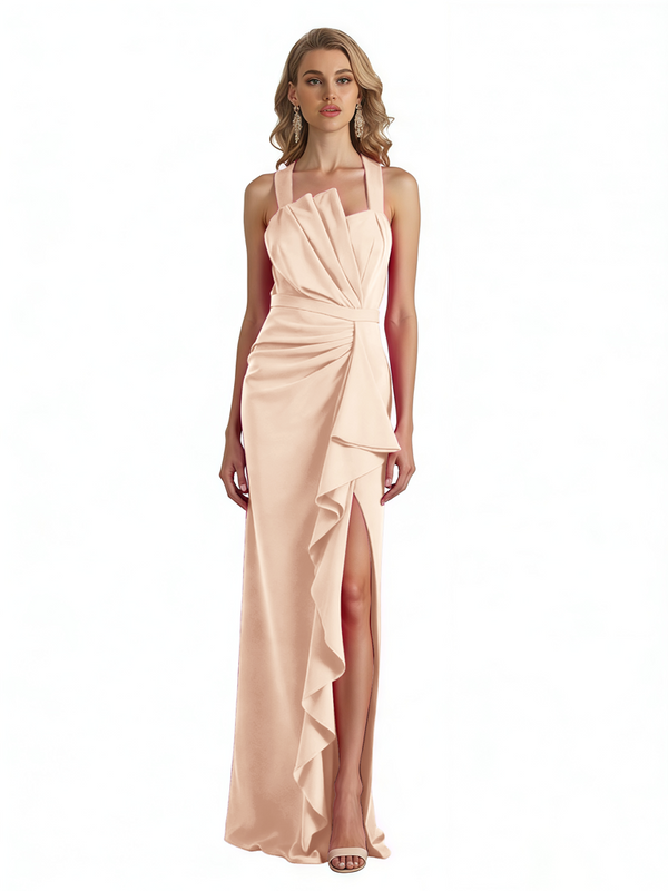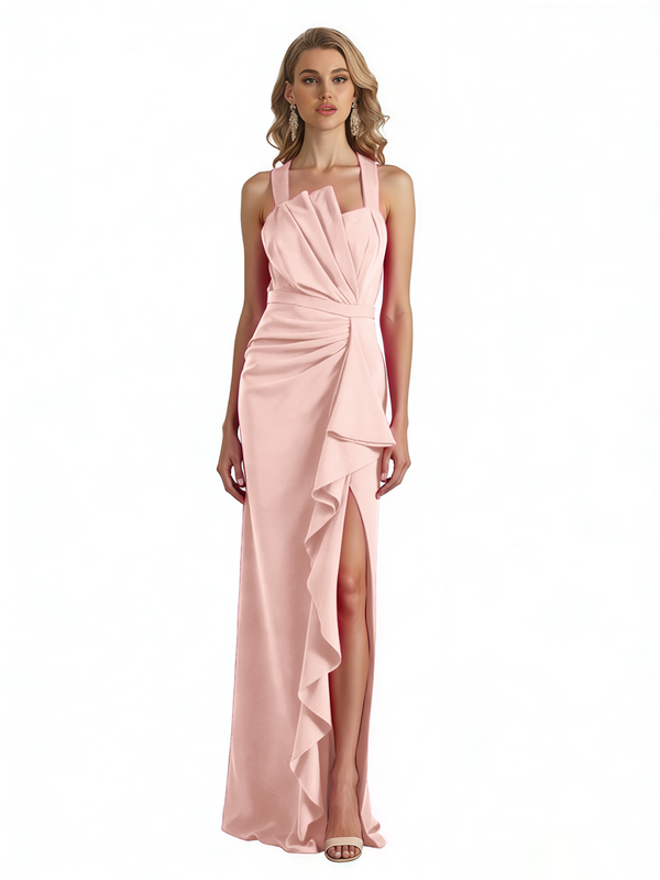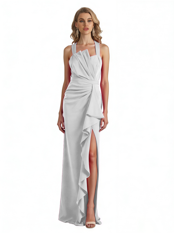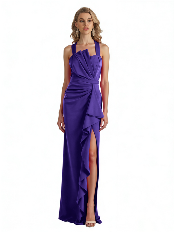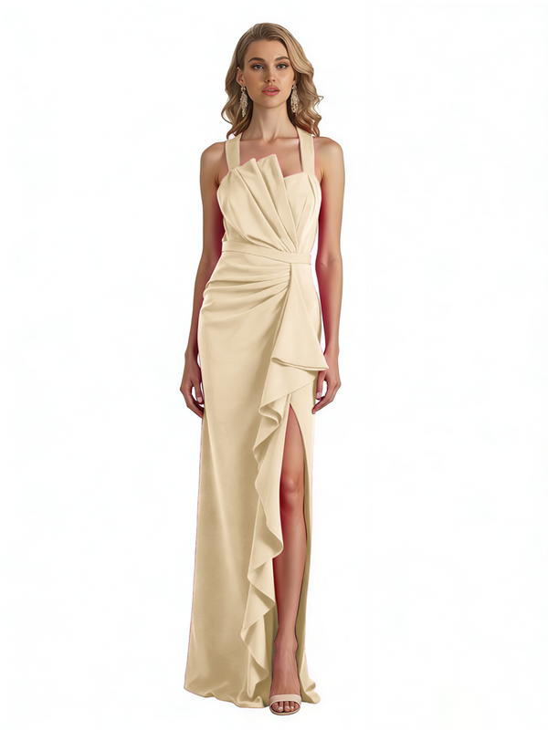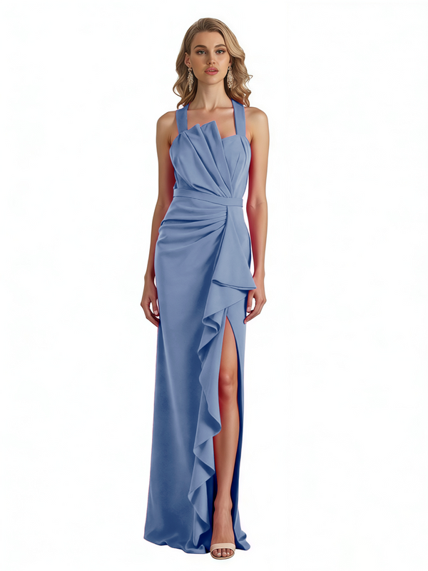 Sexy Spaghetti Straps Silky Satin Ruffle Side Slit Mermaid Long Formal Evening Dresses