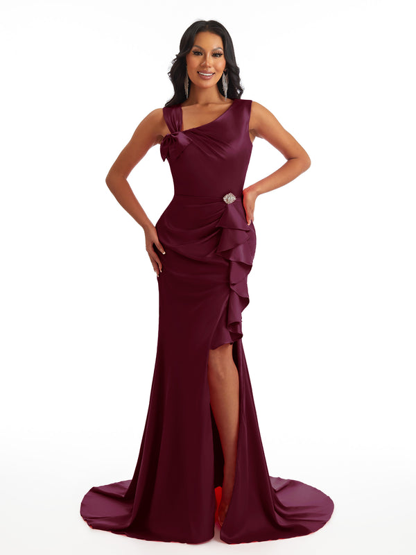 Elegant Asymmetrical Neck Side Split Mermaid Soft Satin Long Bridesmaid Dresses