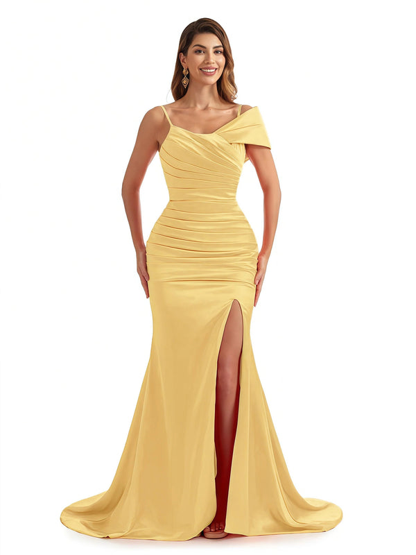 Sexy Side Split Asymmetric Straps Mermaid Chic Satin Long Maid of Honor Dresses