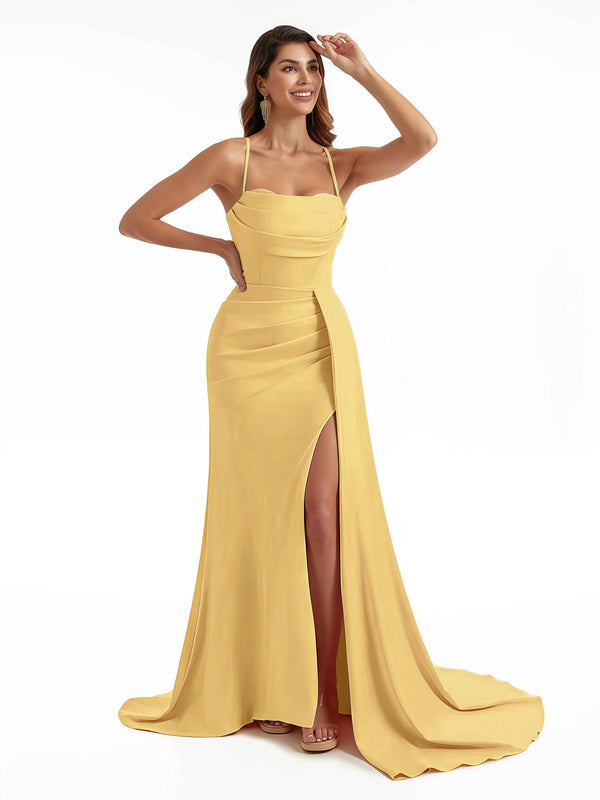 Sexy Side Split Spaghetti Straps Mermaid Long Satin Formal Pleated Bridesmaid Dresses