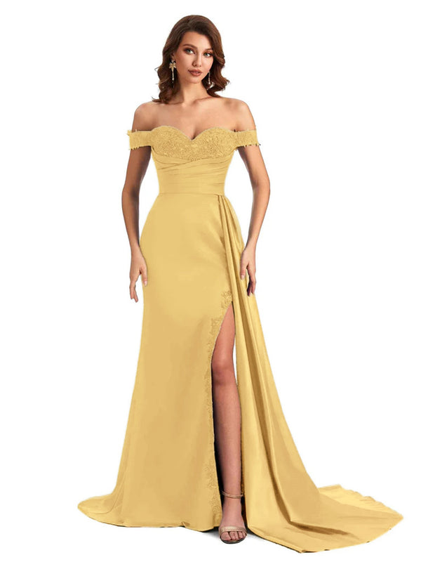 Sexy Off The Shoulder Mermaid Side Slit Silky Satin Long Bridesmaid Dress For Wedding