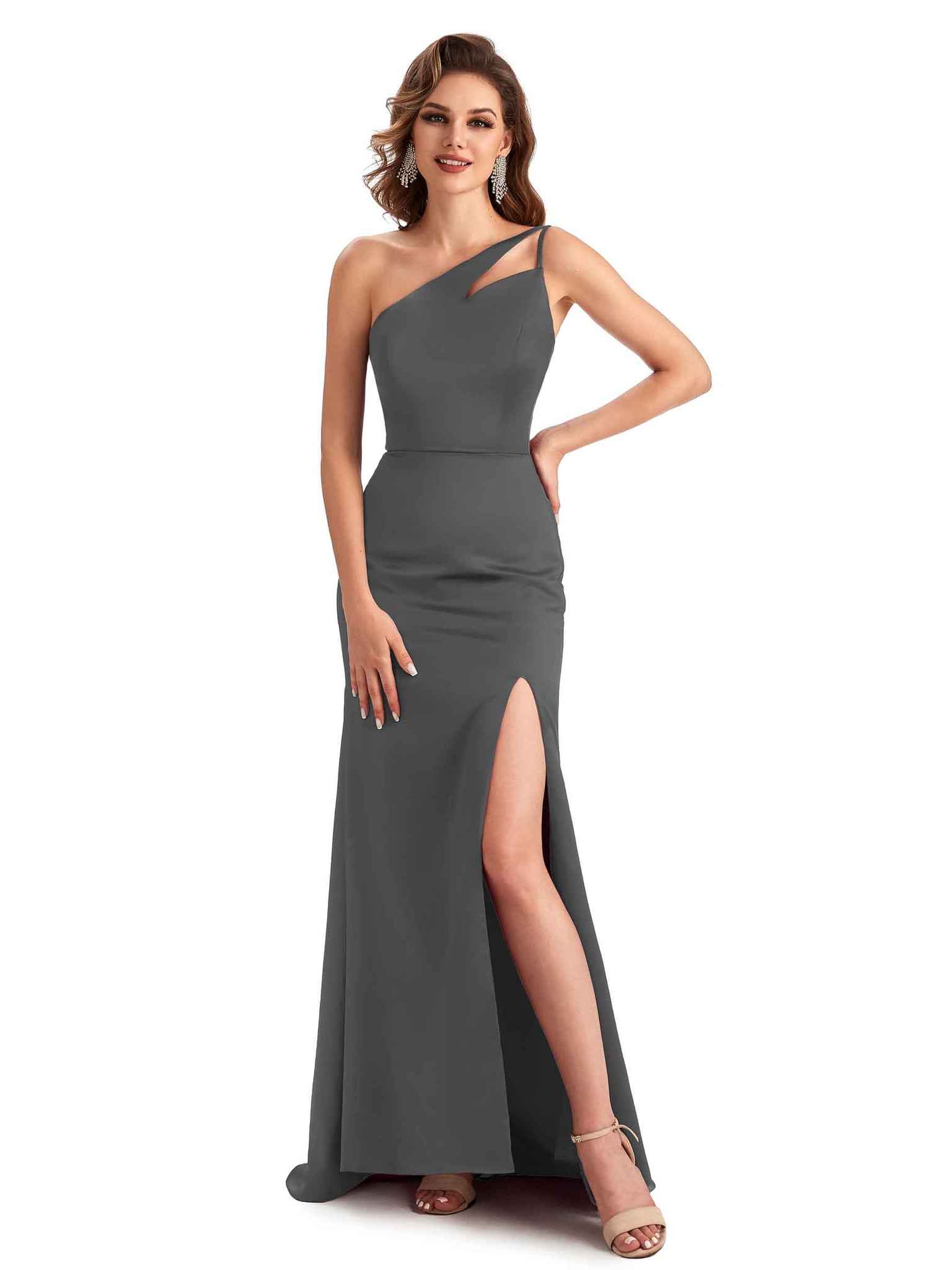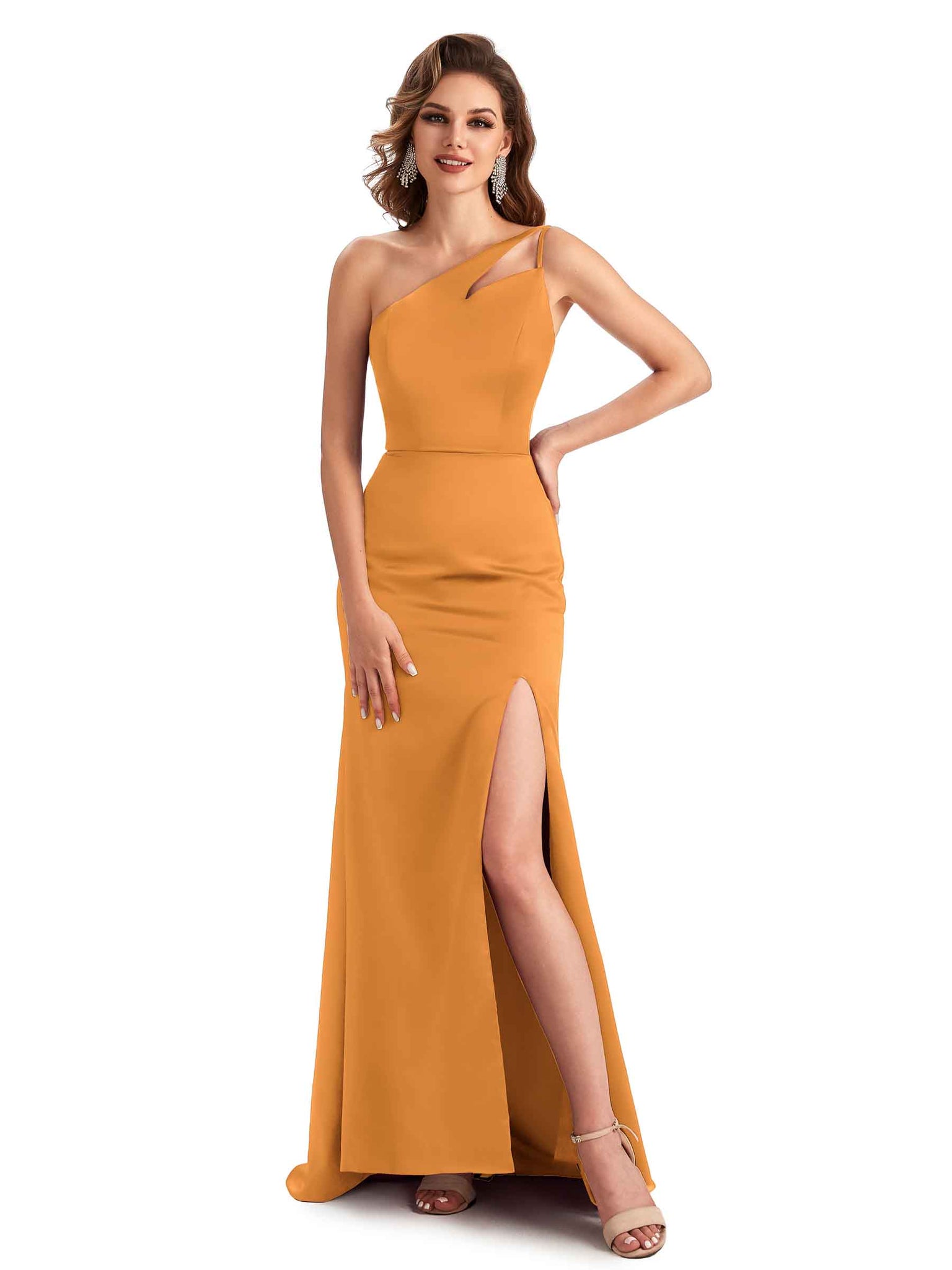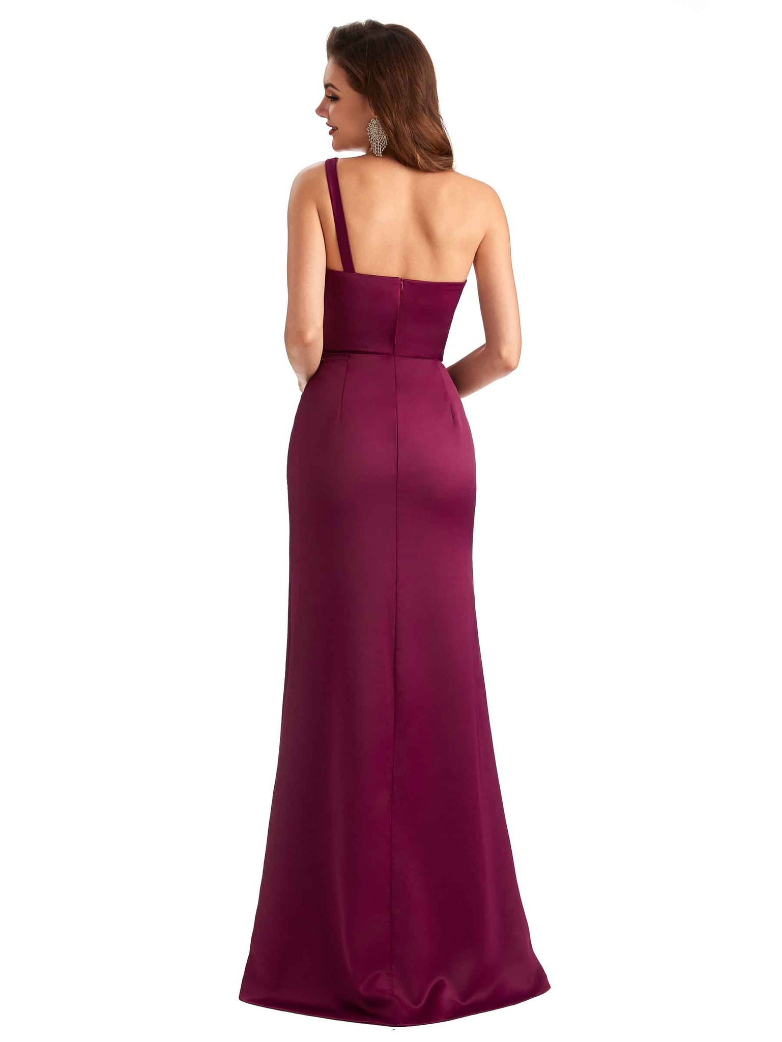 Sexy One Shoulder Side Slit Mermaid Silky Satin Unique Long Wedding Party Guest Dresses