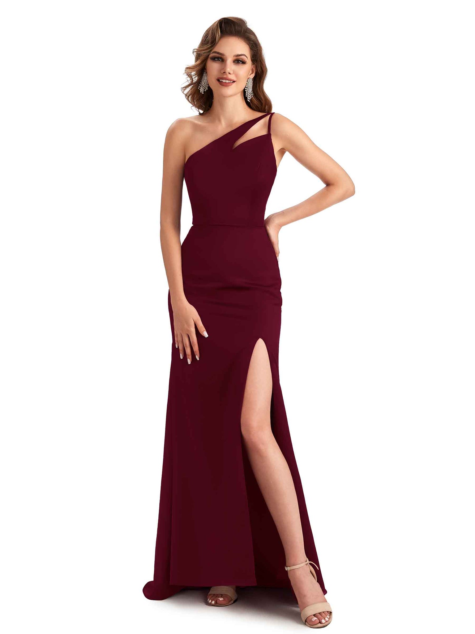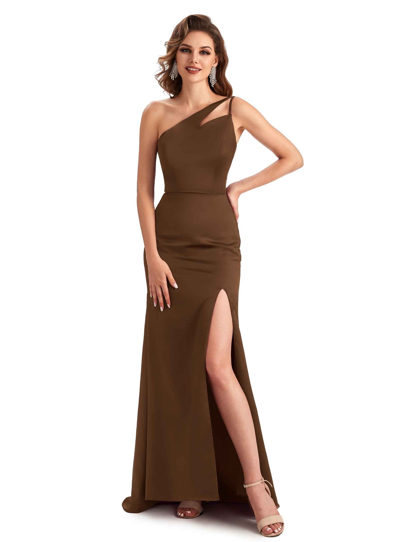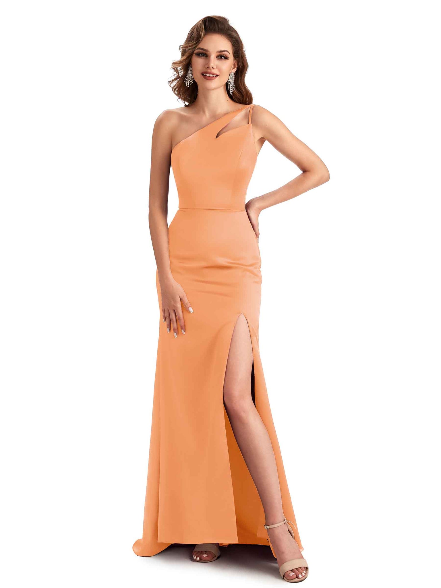 Sexy One Shoulder Side Slit Mermaid Silky Satin Unique Long Wedding Party Guest Dresses