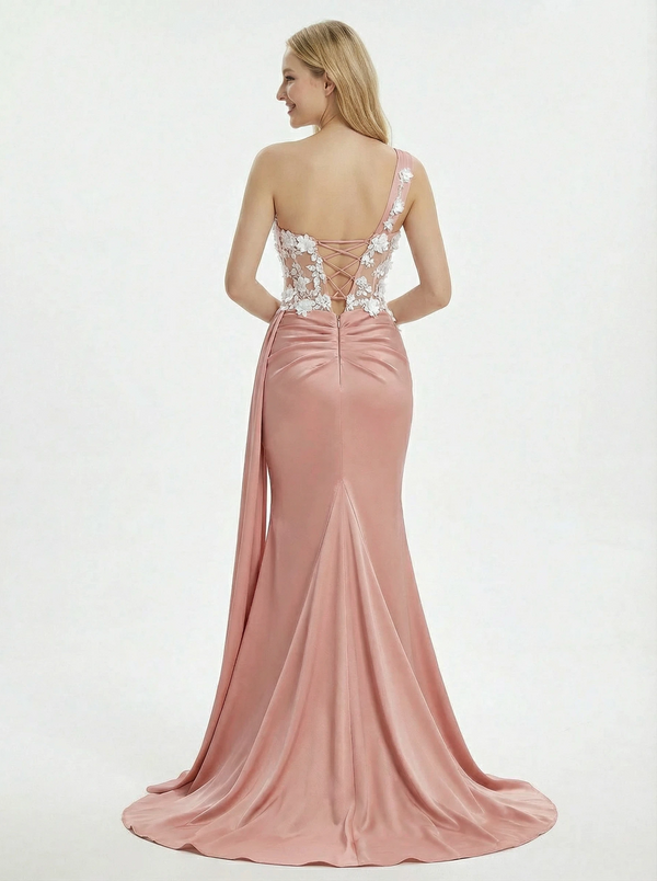 Stunning One Shoulder Floral Appliques Ruched Satin Mermaid Prom Gown