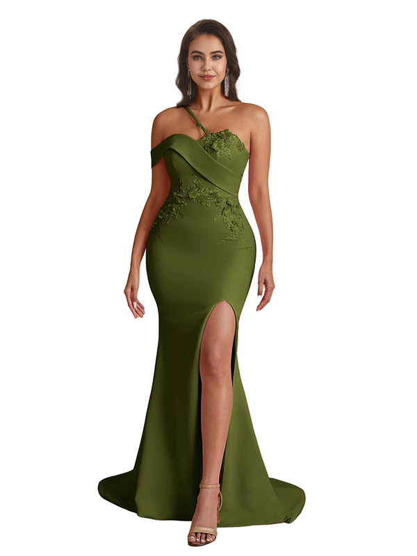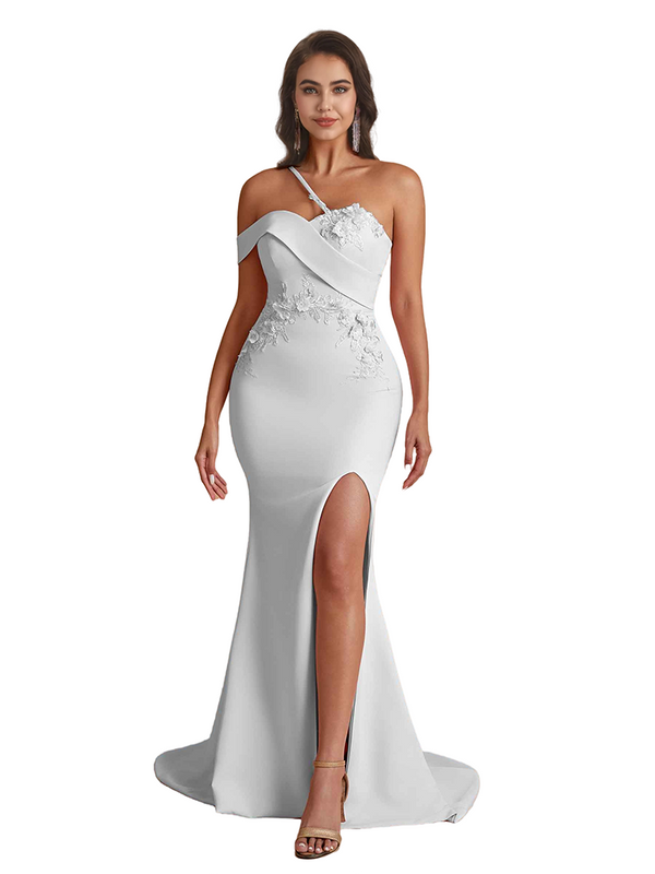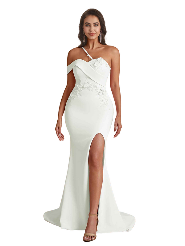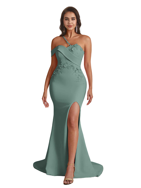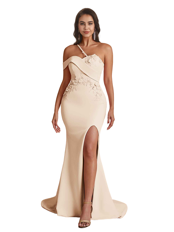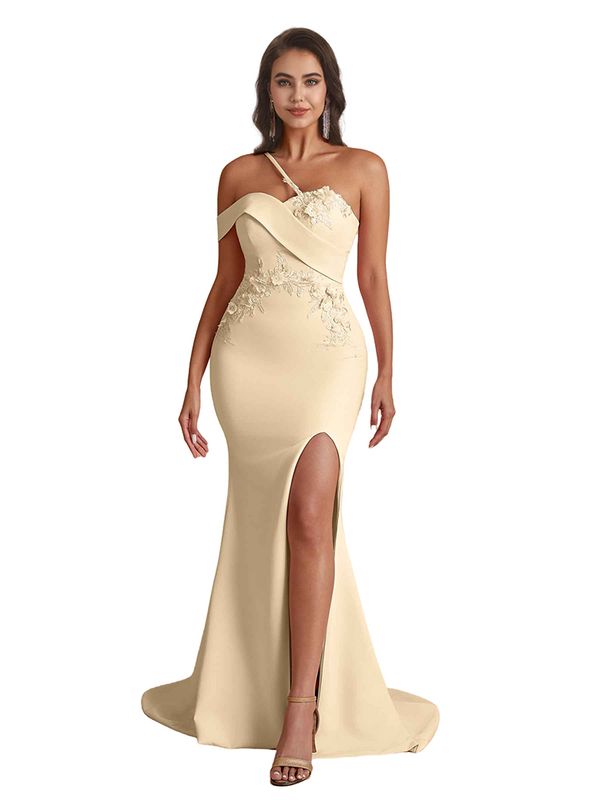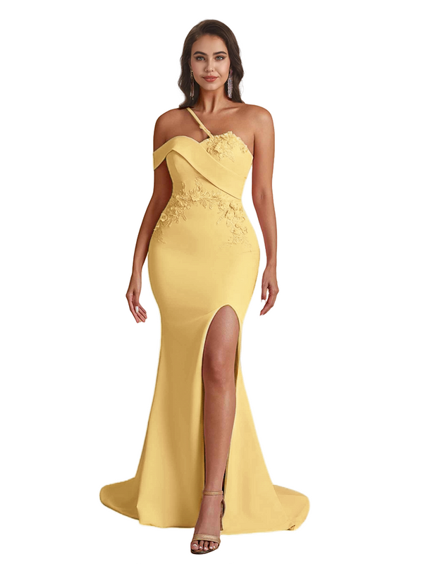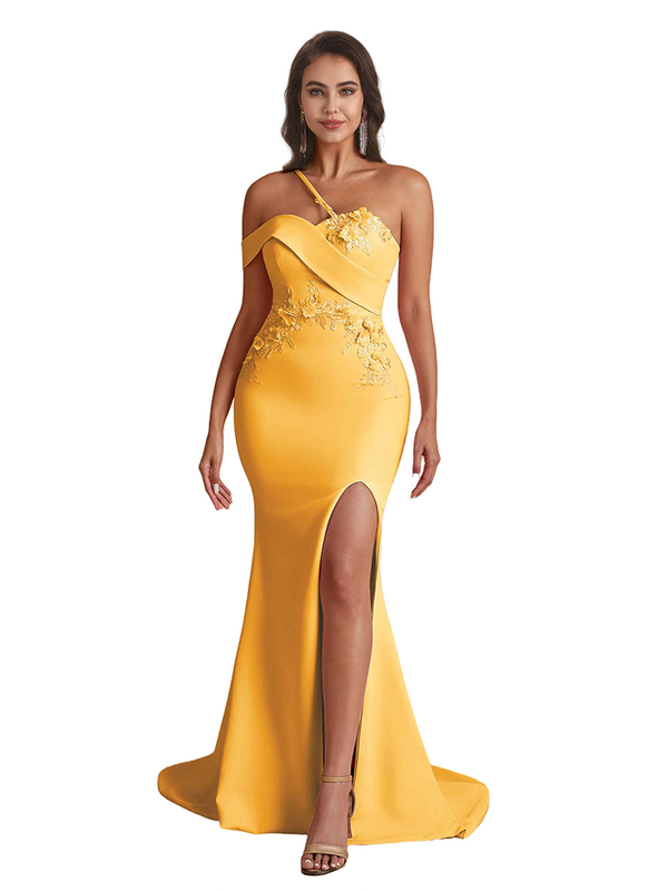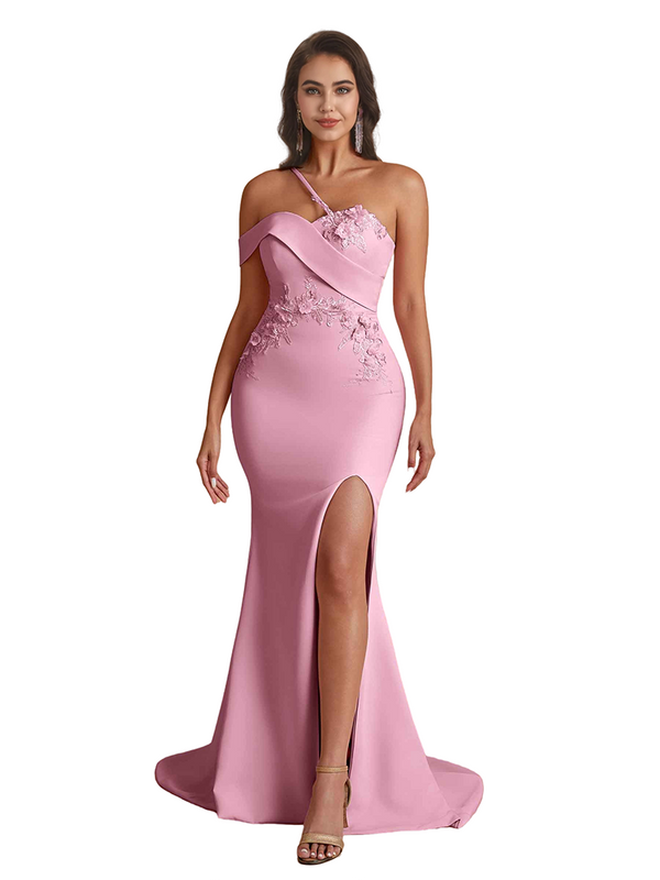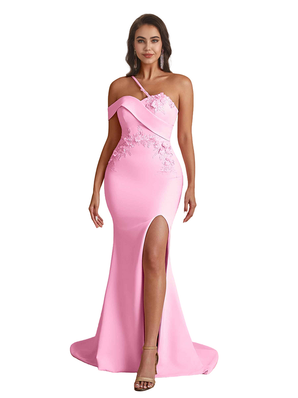 Elegant One Shoulder Mermaid Handmade Flower Satin Long Bridesmaid Dresses Side Split