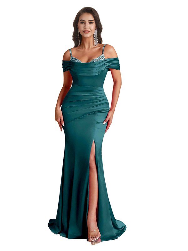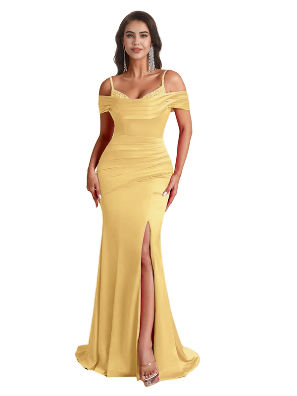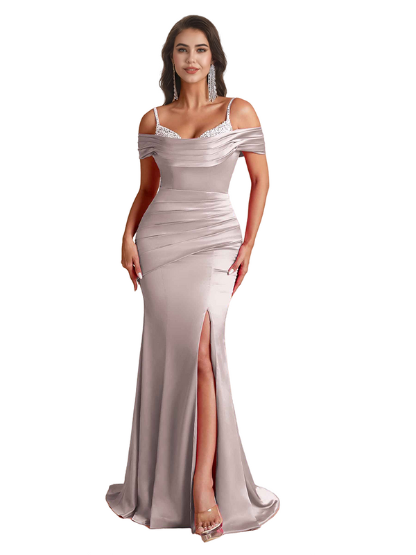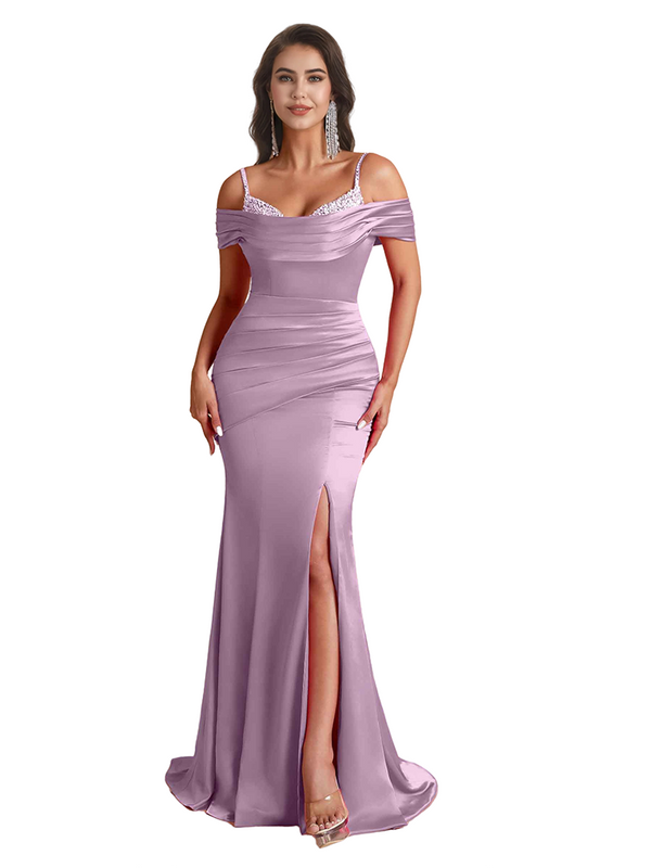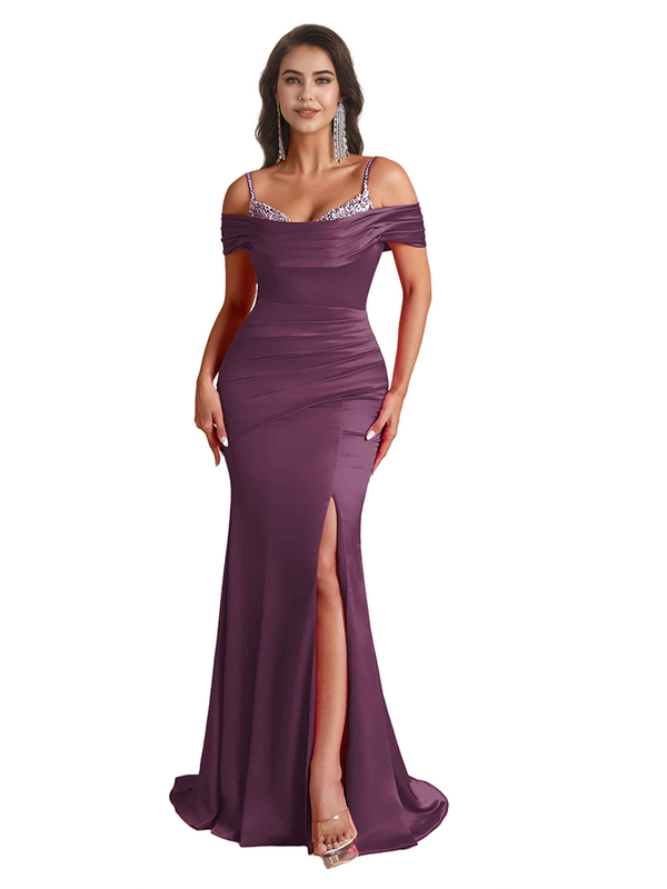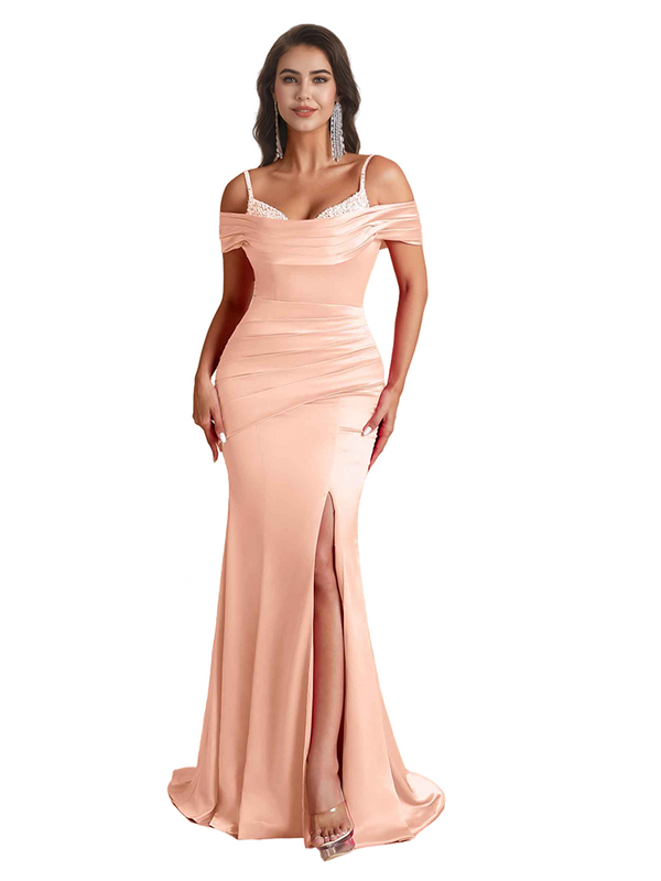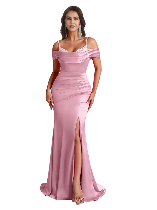Elegant Cold Shoulder Mermaid Ruched Satin Long Bridesmaid Dresses Online Side Split