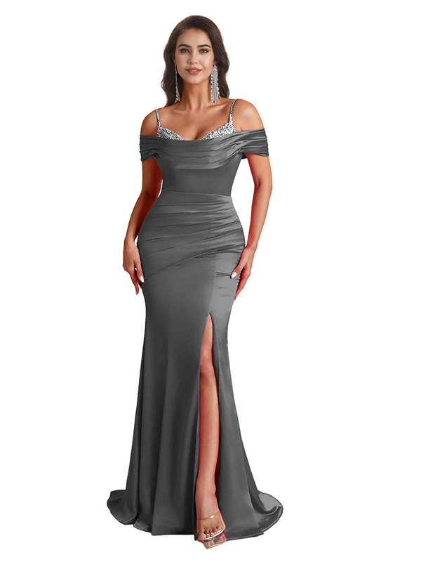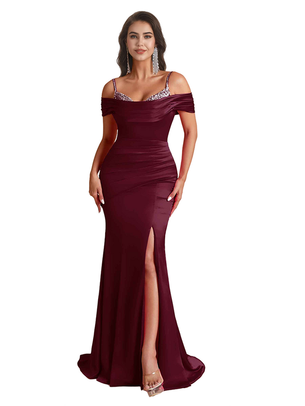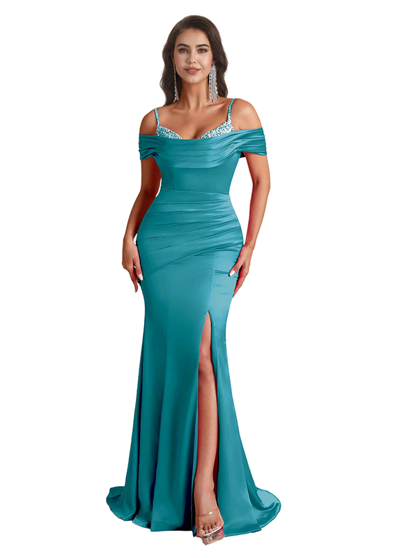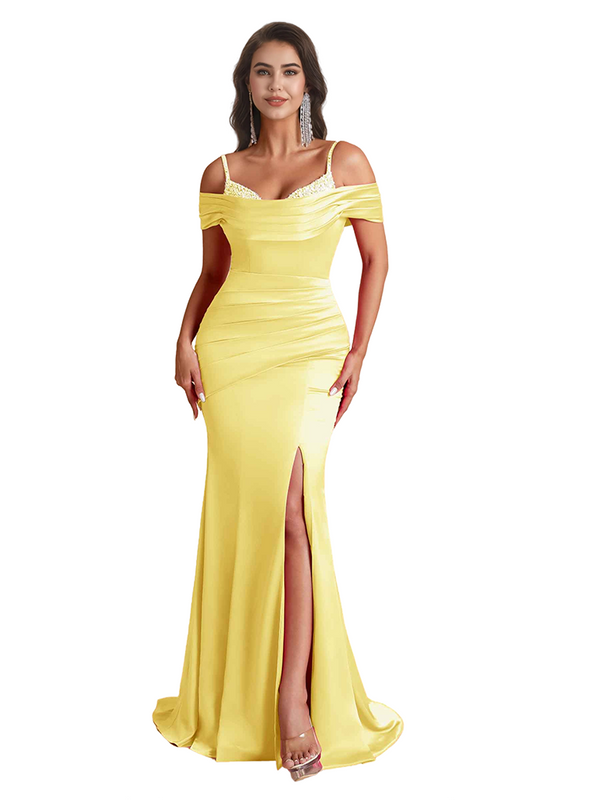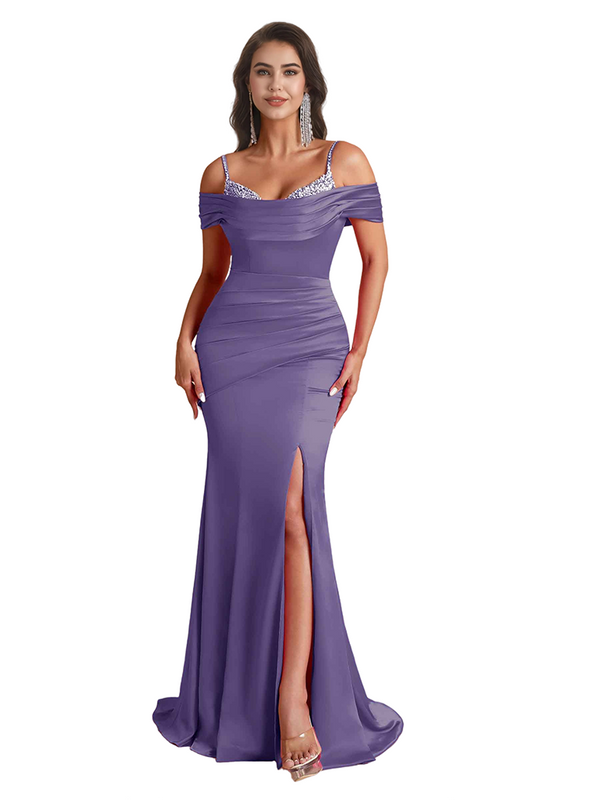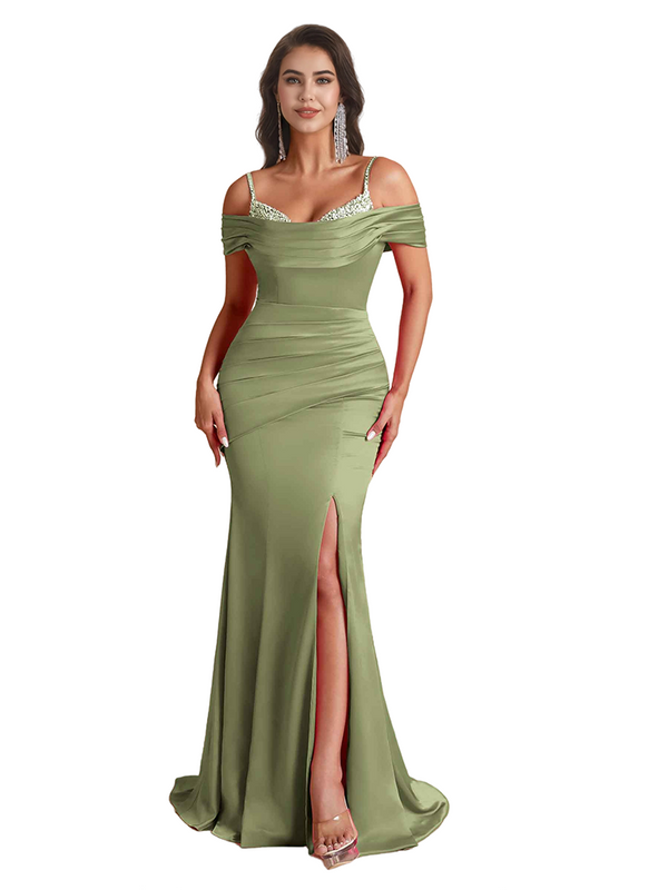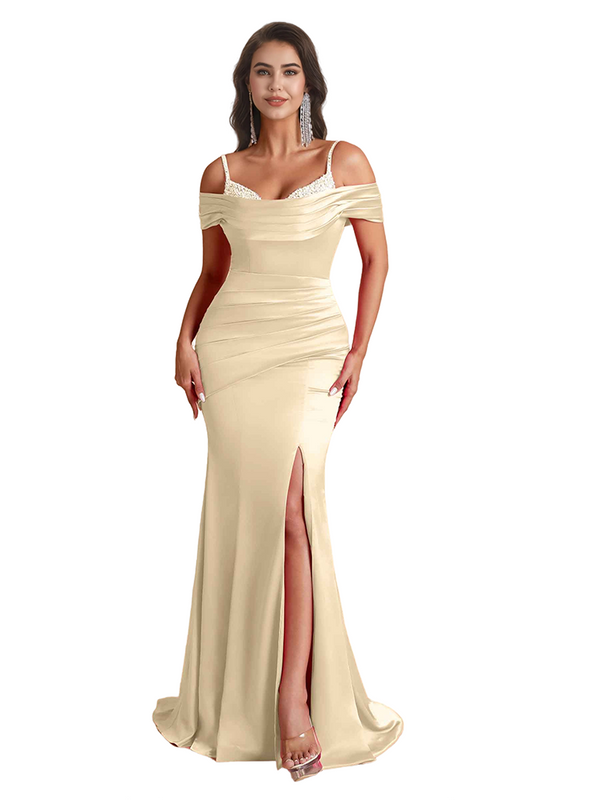 Elegant Cold Shoulder Mermaid Ruched Satin Long Bridesmaid Dresses Online Side Split