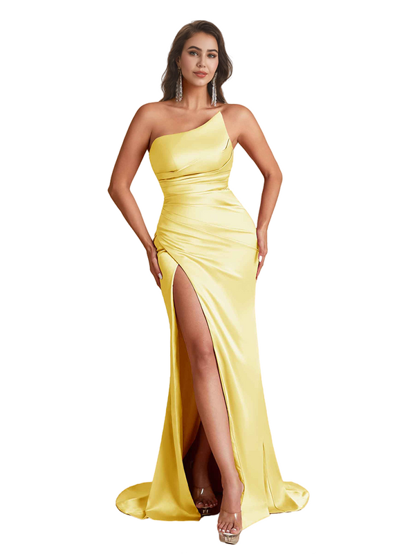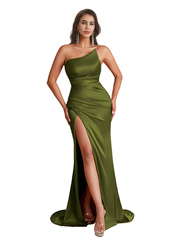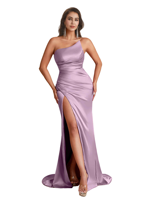 Elegant One Shoulder Mermaid Silky Satin Long Bridesmaid Dresses Online Side Split
