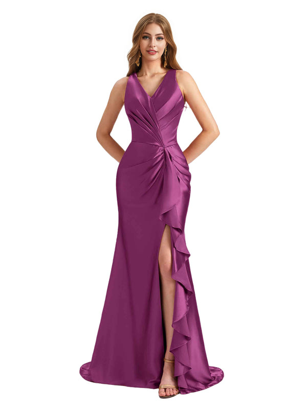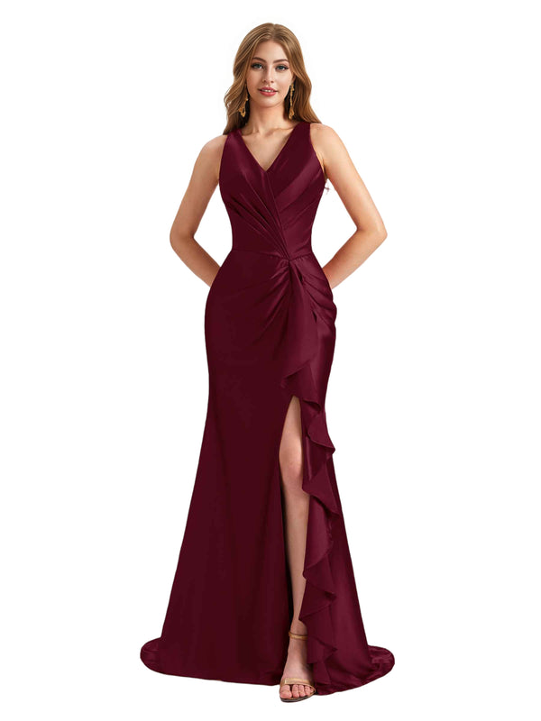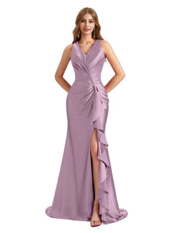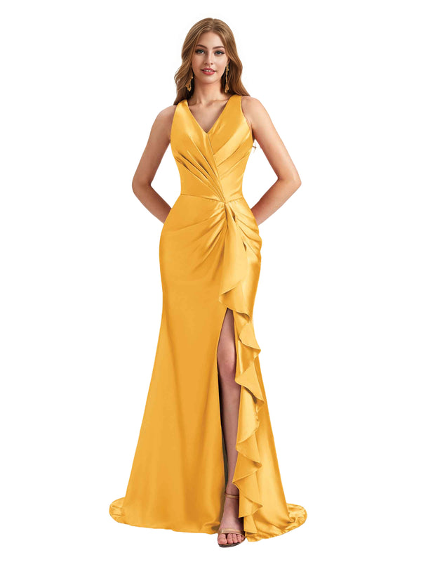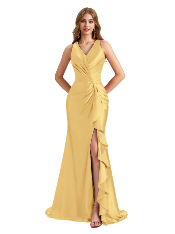 Elegant V-Neck Ruffles Satin Side Split Mermaid Long Bridesmaid Dresses Online