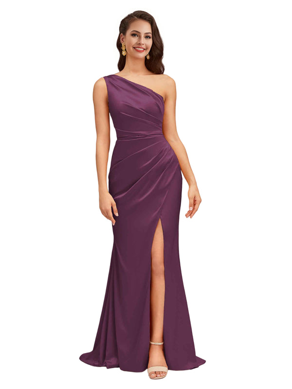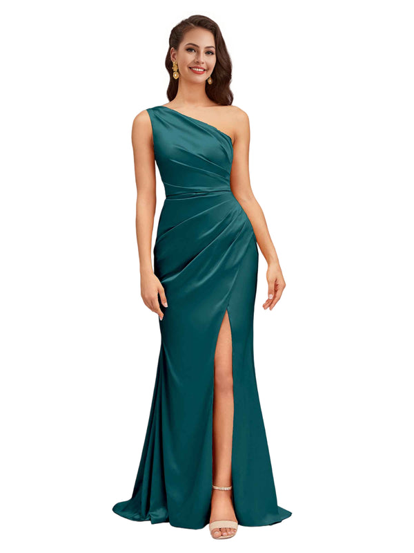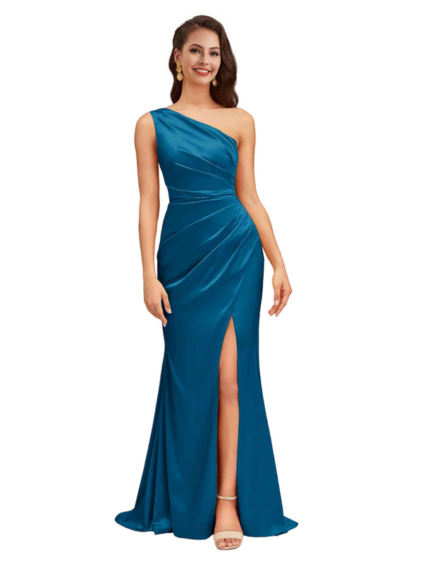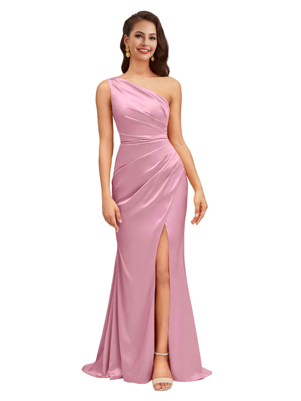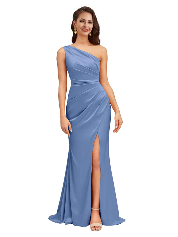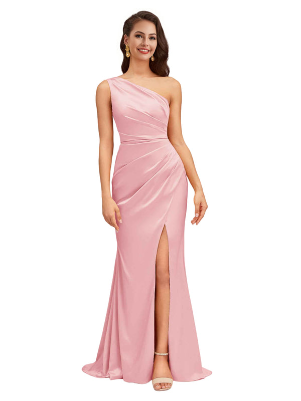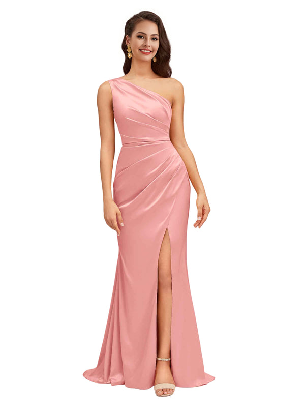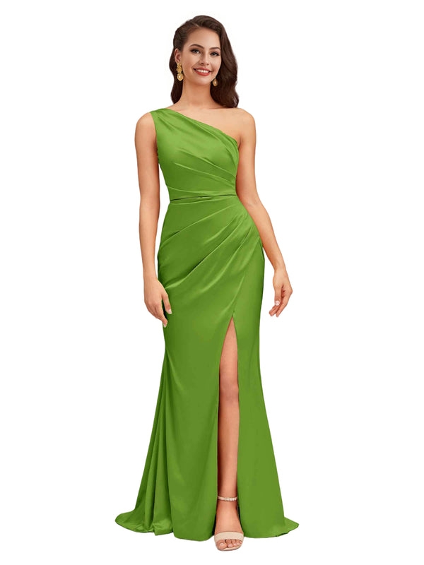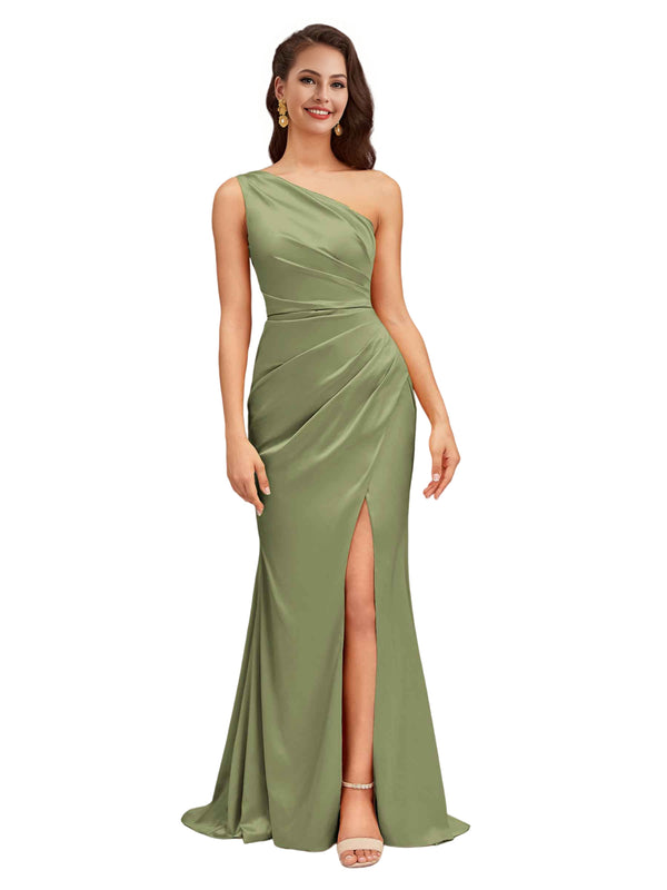 Sexy Mermaid One Shoulder Side Slit Beauty Long Soft Satin Bridesmaid Dresses Online
