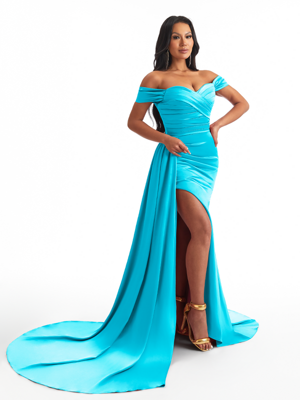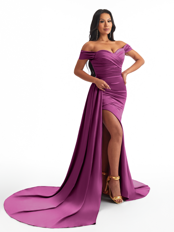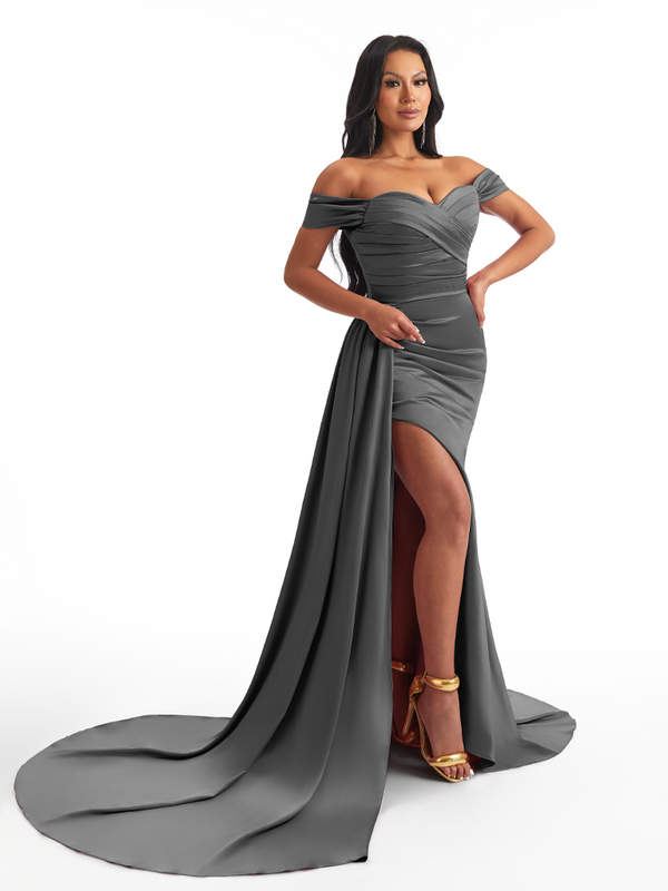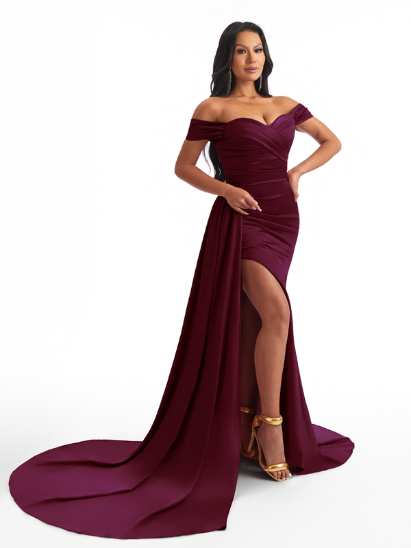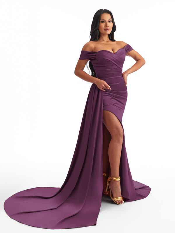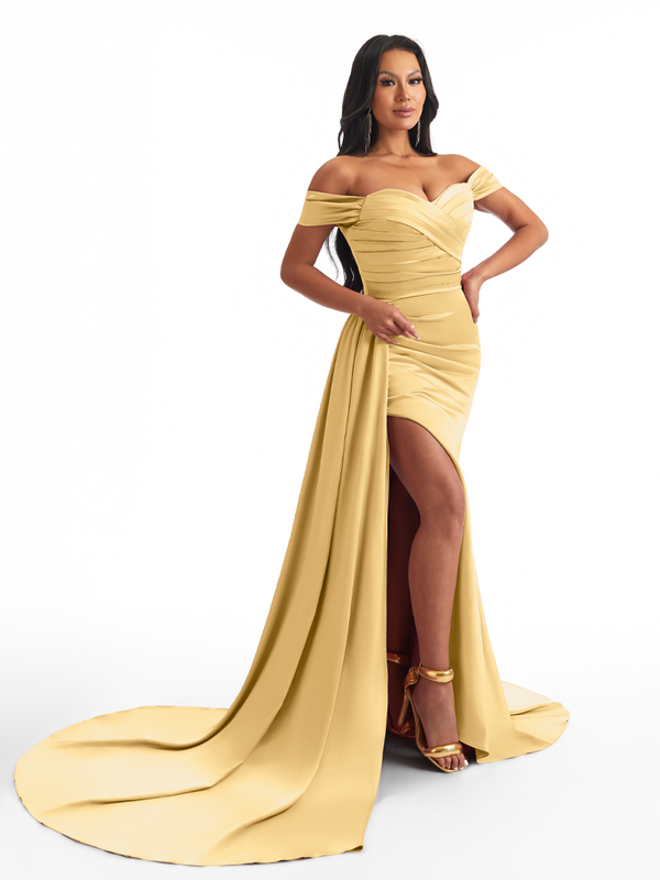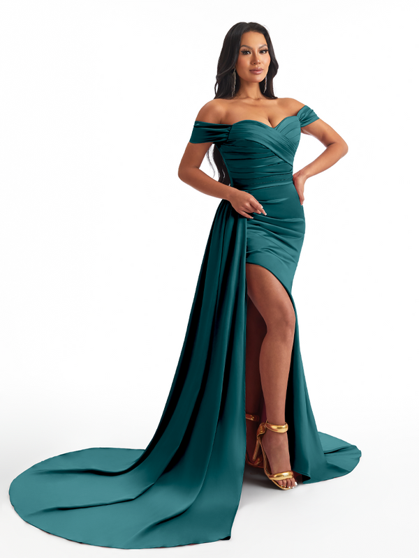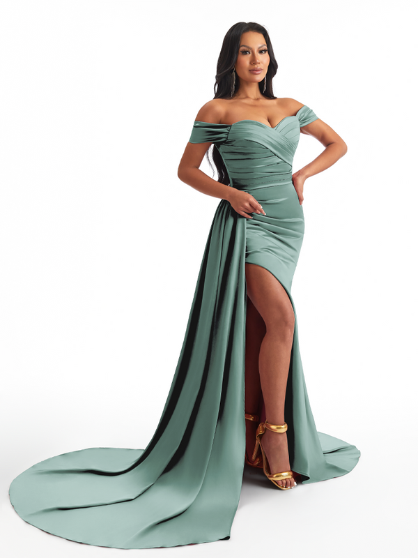 Sexy Off Shoulder Side Split Mermaid Soft Satin Long Bridesmaid Dresses