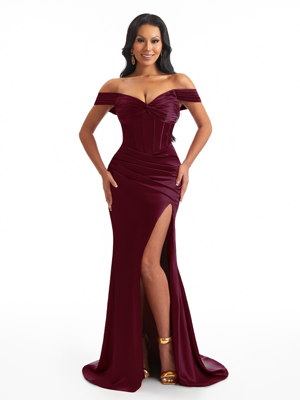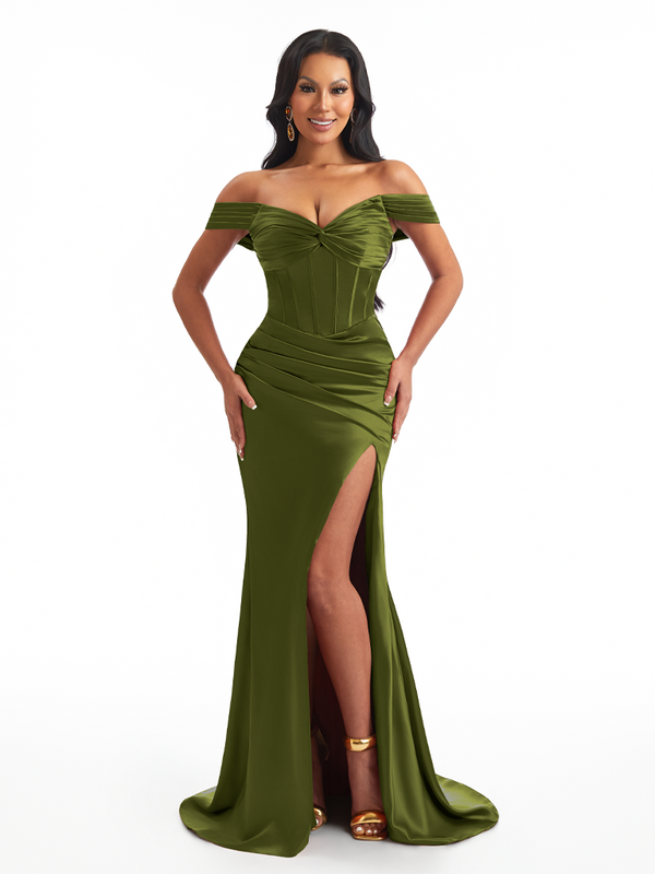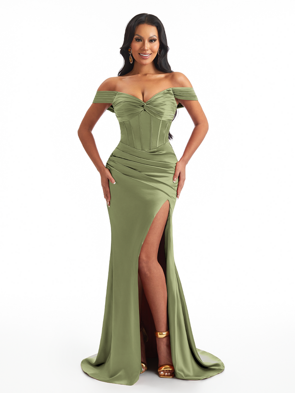 Sexy Off The Shoulder Side Split Mermaid Soft Satin Pretty Long Bridesmaid Dresses