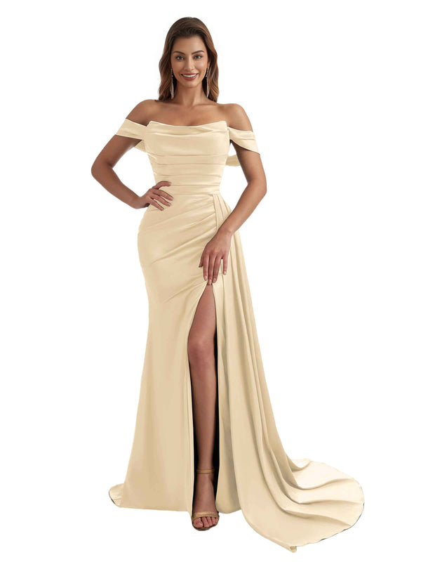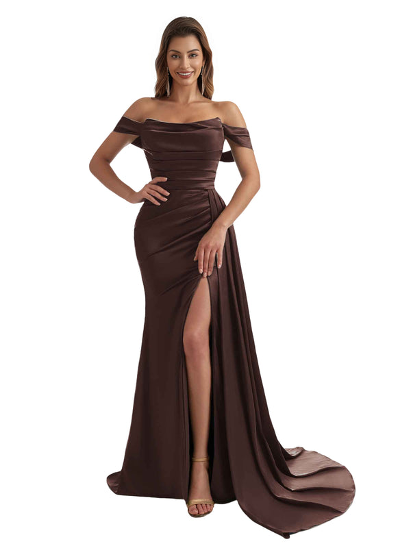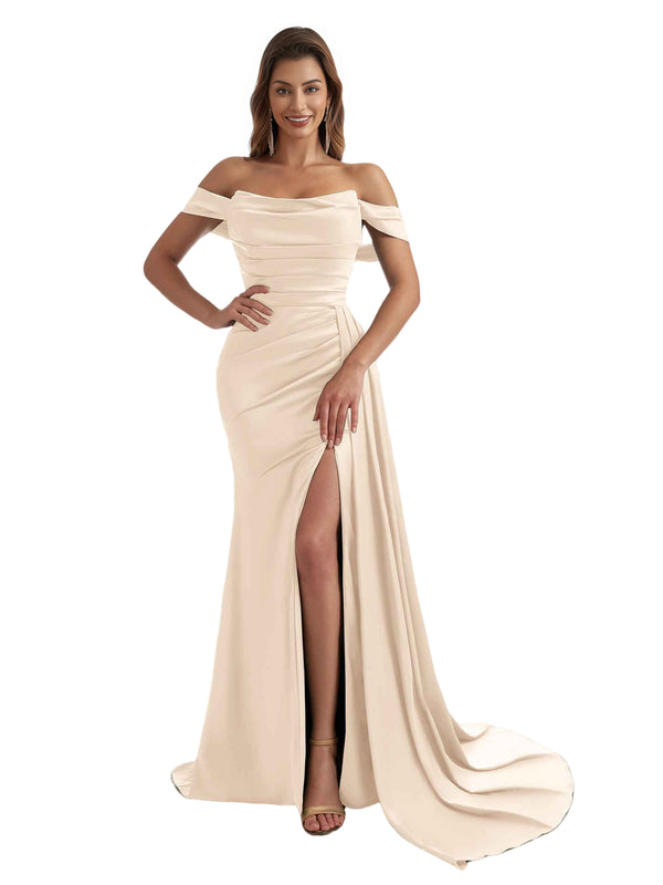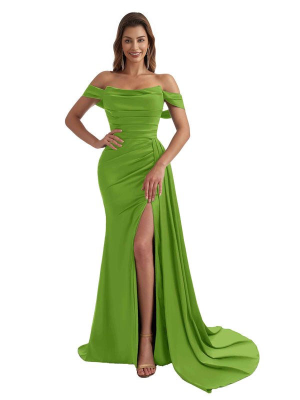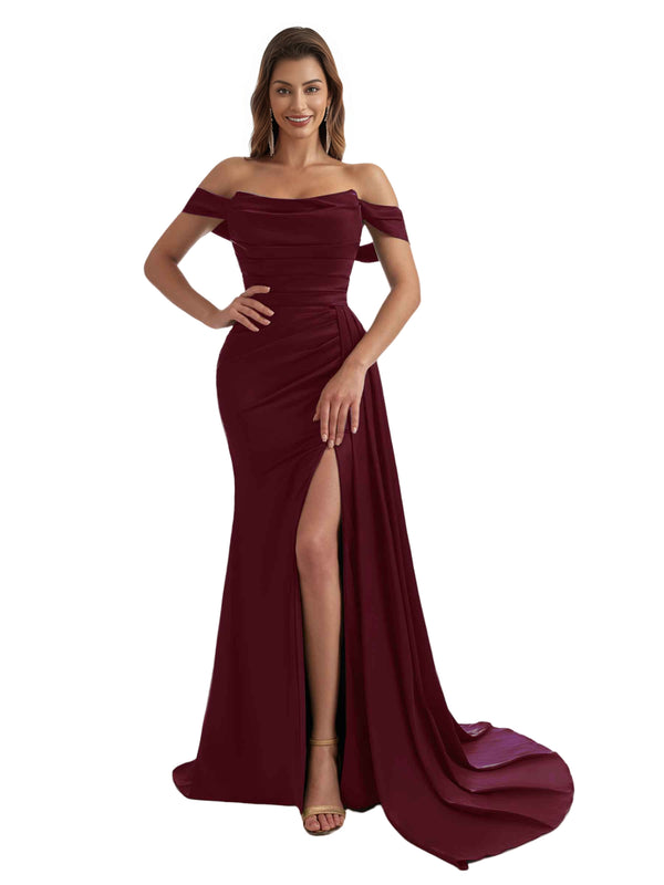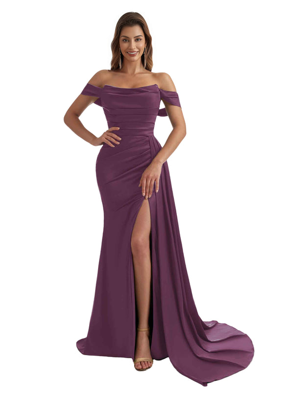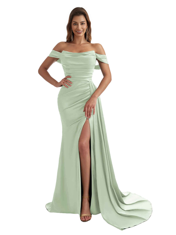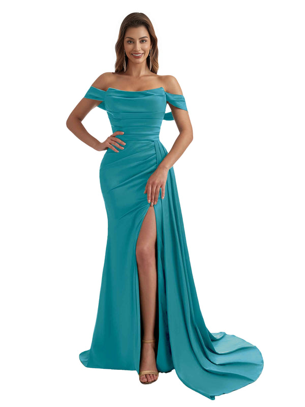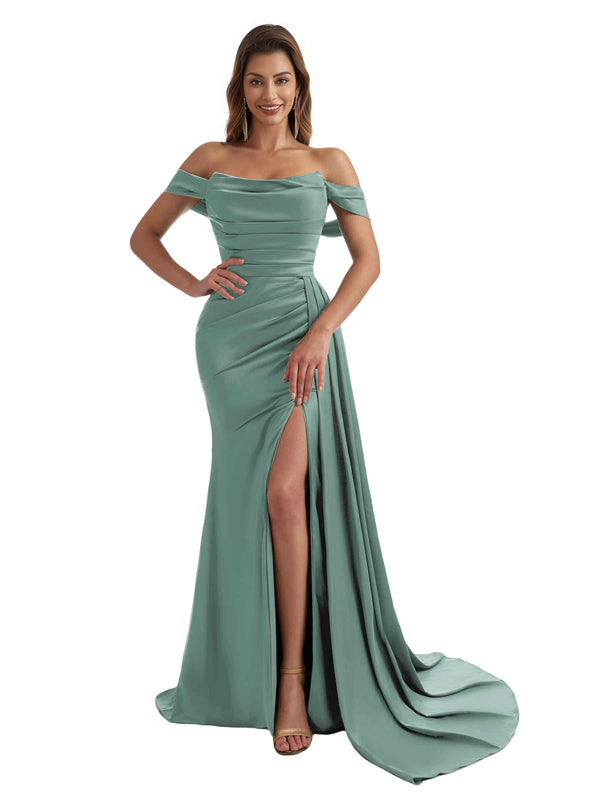 Sexy Off The Shoulder Side Split Mermaid Ruched Satin Pretty Long Bridesmaid Dresses