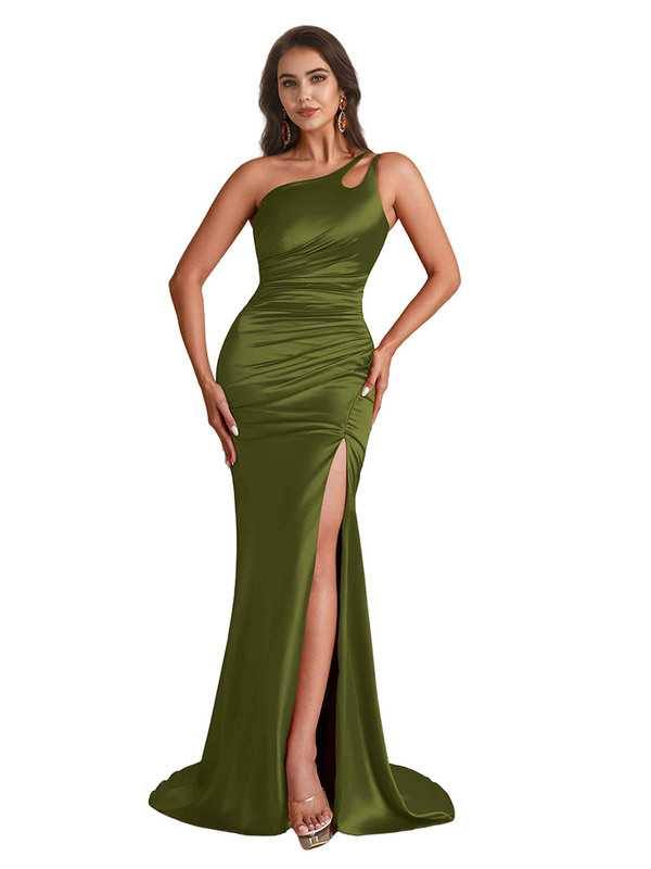 Modern One Shoulder Mermaid Ruched Satin Pretty Long Bridesmaid Dresses Side Split