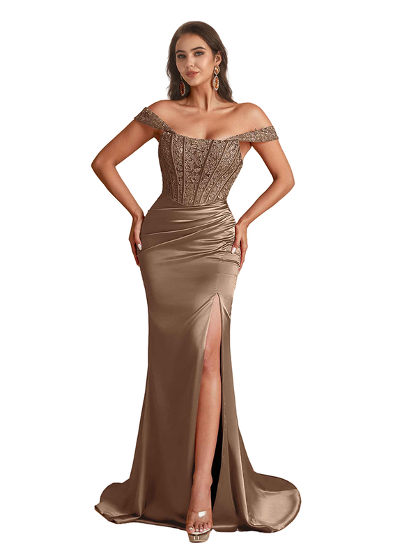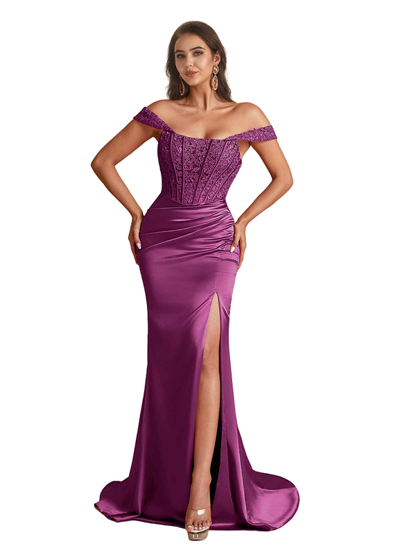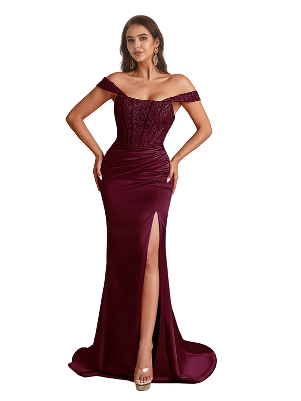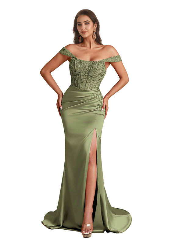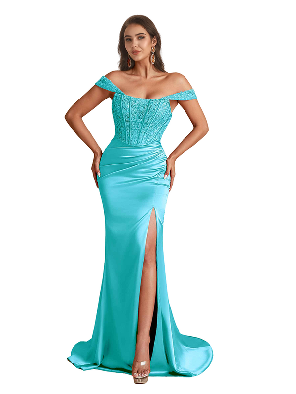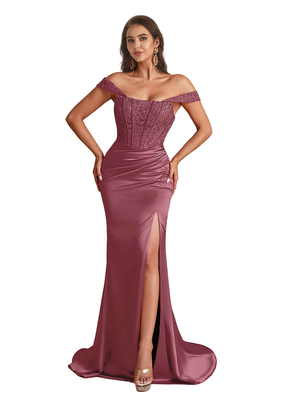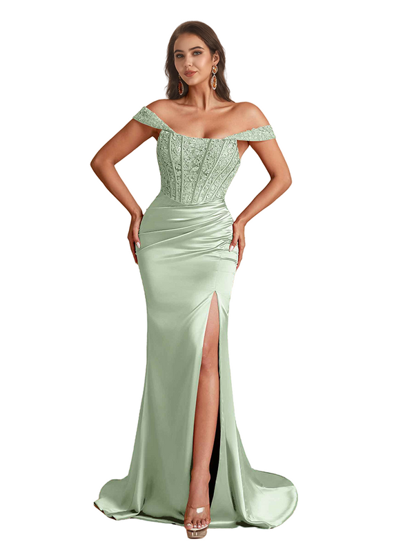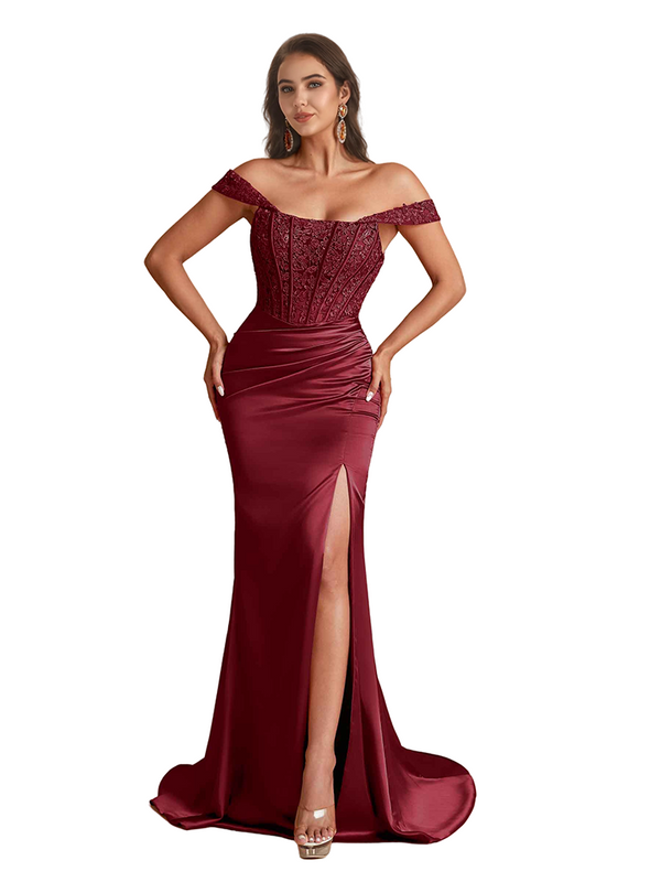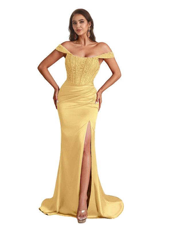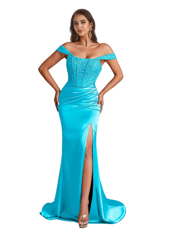 Sexy Satin Off The Shoulder Lace Mermaid Long Bridesmaid Dresses Slit