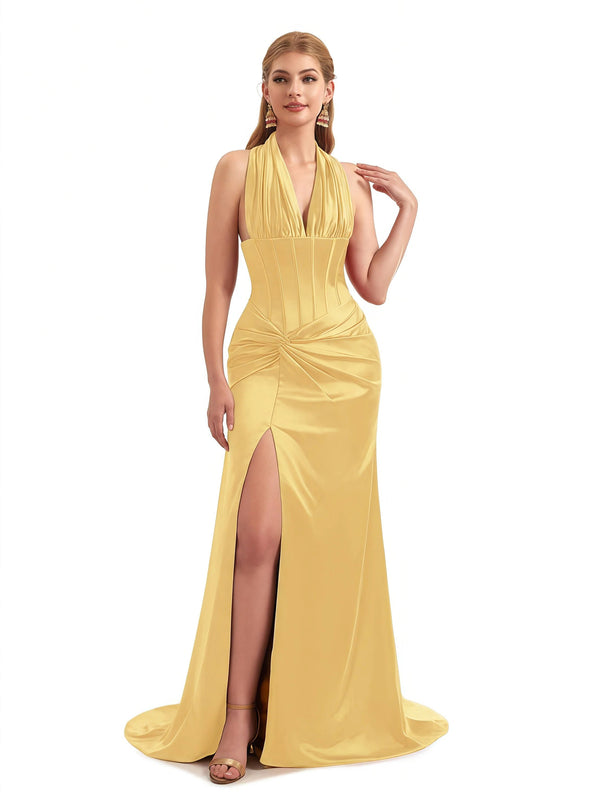 Sexy Side Slit Halter Mermaid Silky Satin Unique Long Boho Chic Bridesmaid Dresses