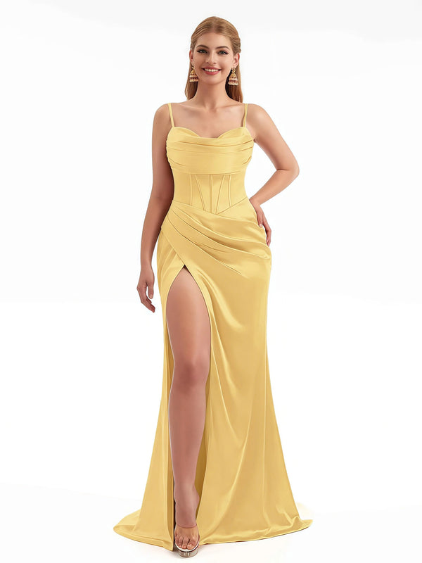 Sexy Side Split Spaghetti Straps Mermaid Silky Satin Pretty Long Bridesmaid Dresses